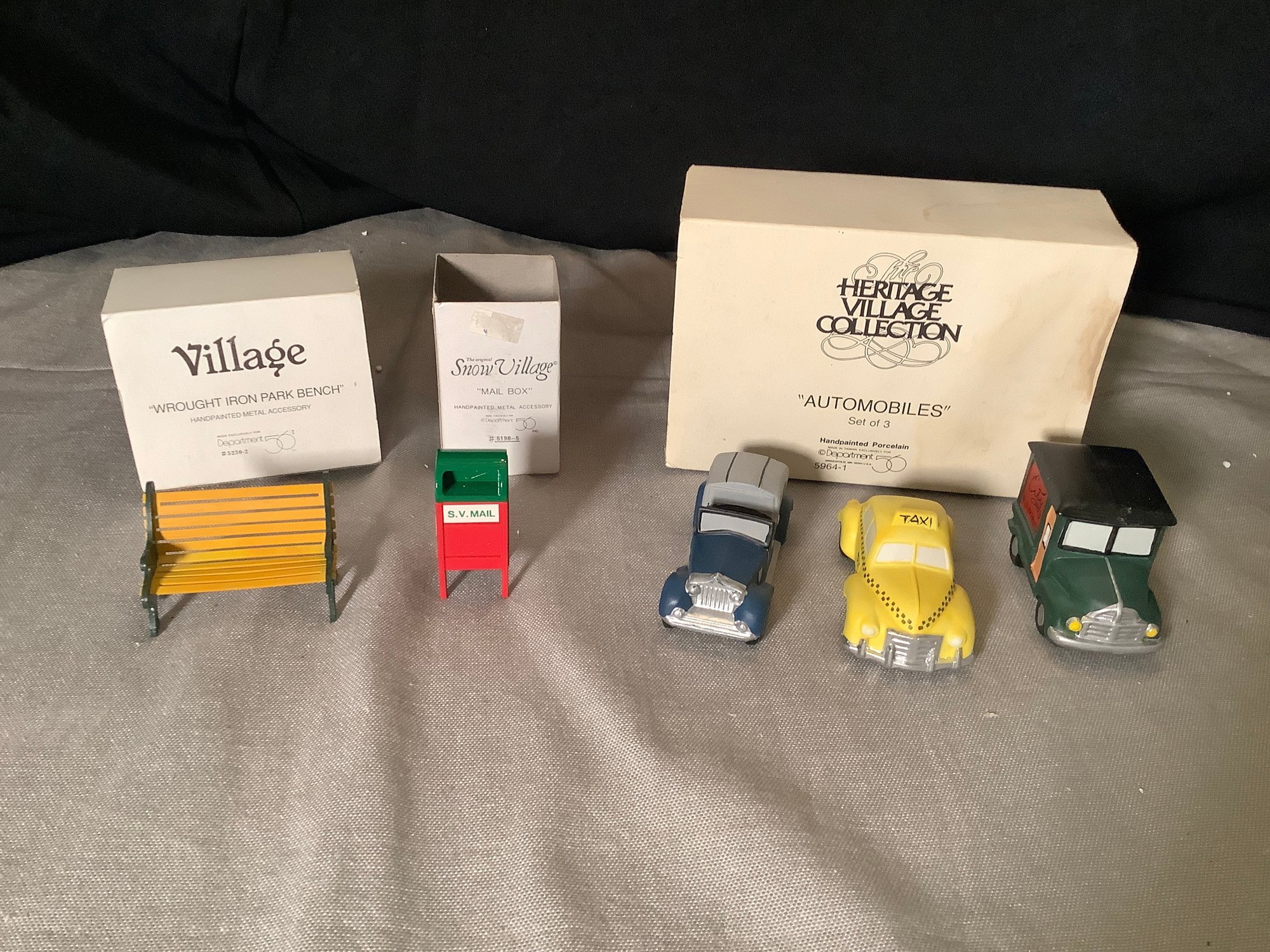 Department 56 Heritage Village and Snow Village. Includes Wrought Iron Park Bench 5230-2, Mail box 5198-5 and Automobiles 5964-1 . Preowned. Photos are part of the description.