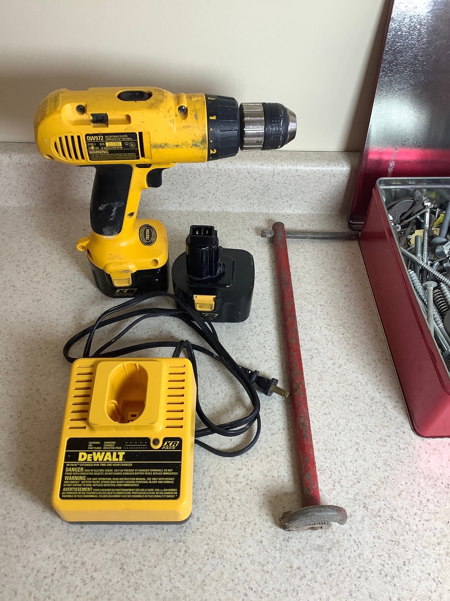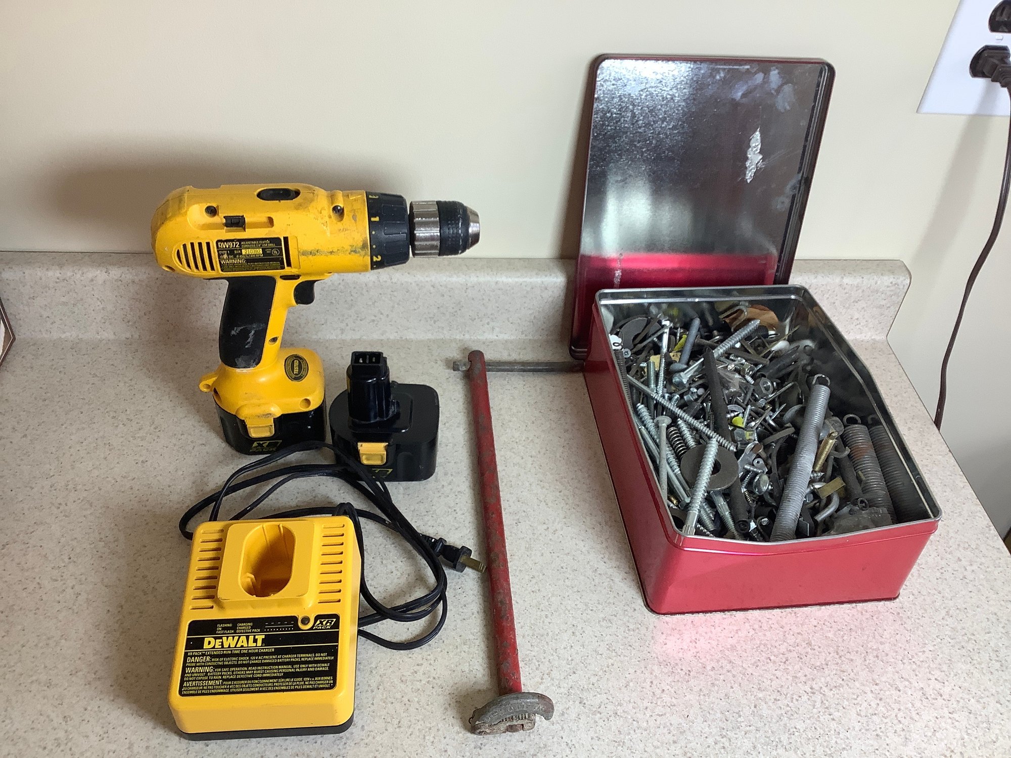 DeWalt cordless drill, sink wrench and assorted hardware. Untested. Photos are part of the description. Preowned. NO SHIPPING
