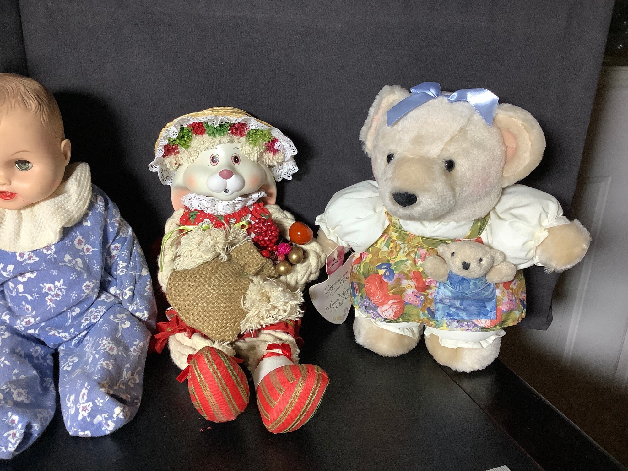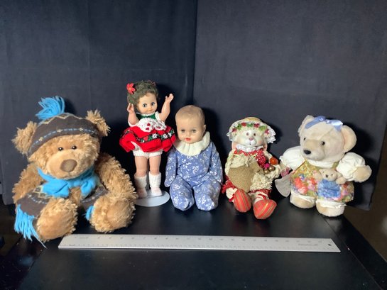 5 piece doll collection. Includes 2 teddy bears, Rabbit and two dolls. Preowned. Photos are part of the description. NO SHIPPING.
