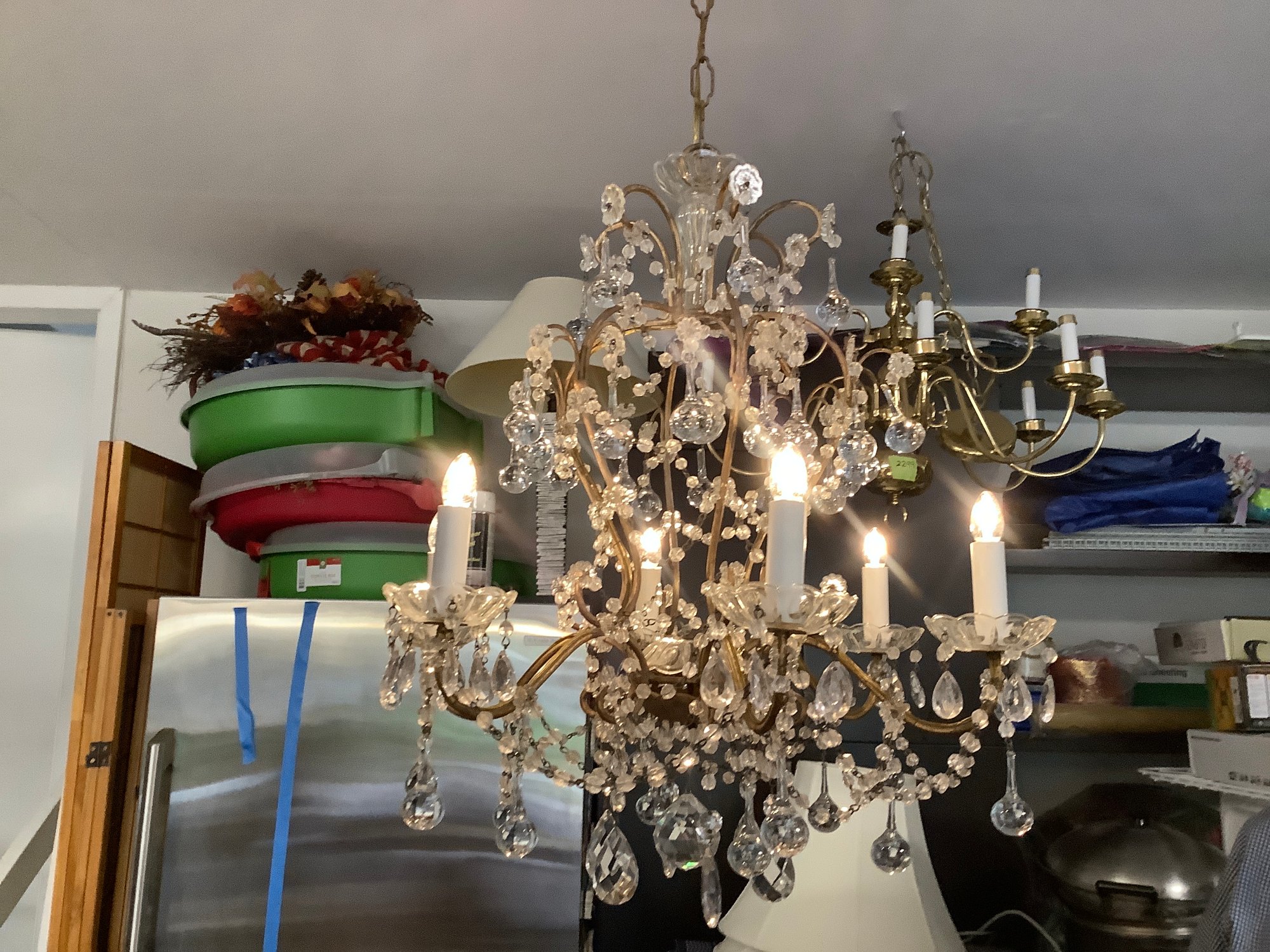 This Chandelier has beautiful antique style crystals .There are 36 tear drop shaped Crystals and others are cut crystal oval shape. In the center are 2 round cut crystals. The canopy is all crystal and there are crystal florets. This chandelier will add elegance to any room.
