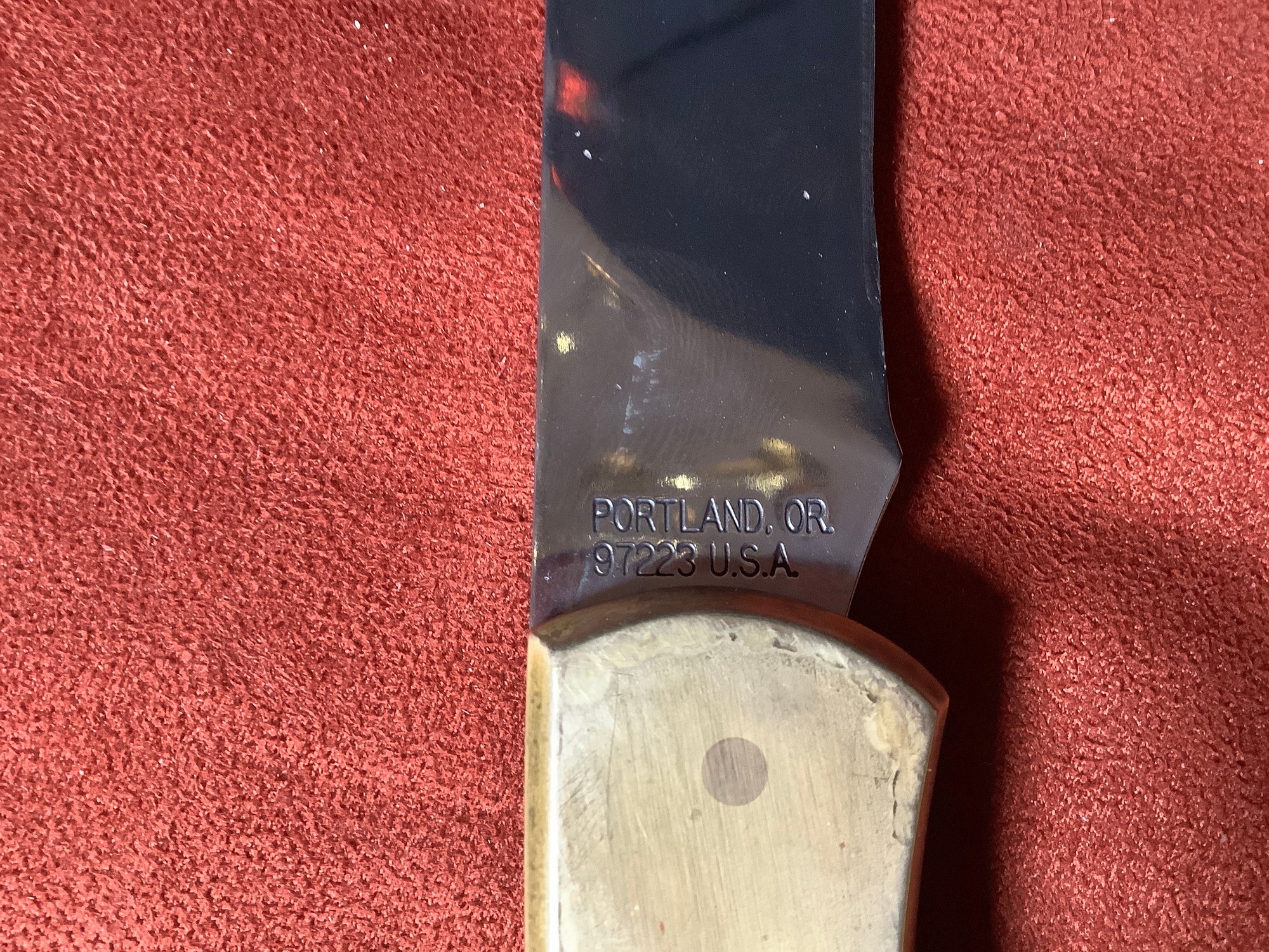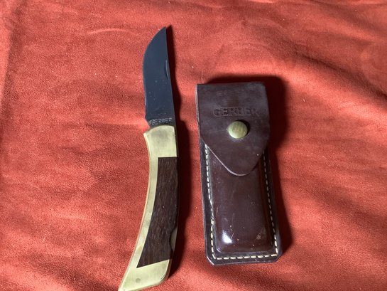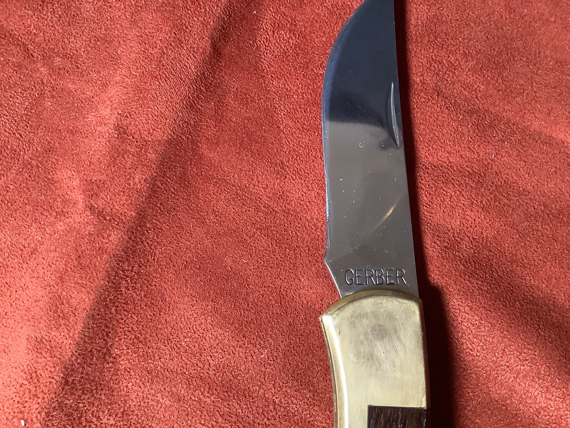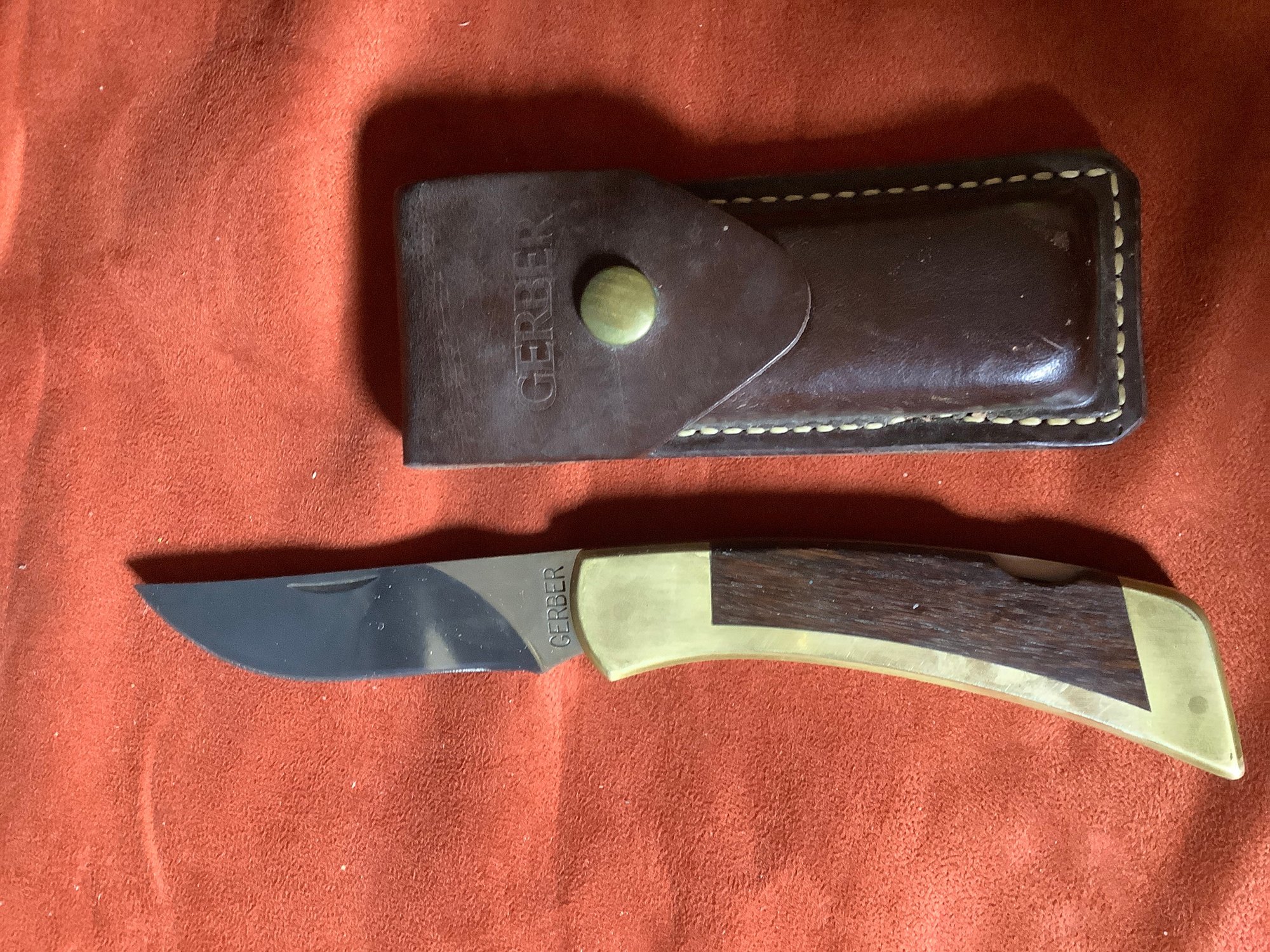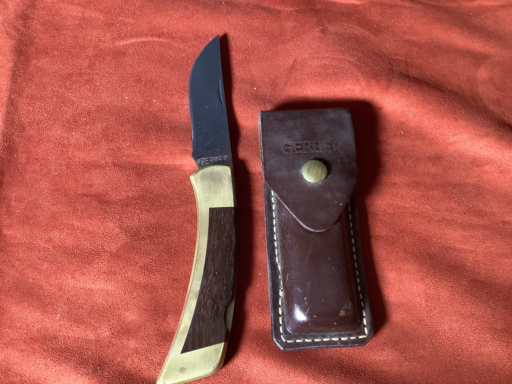 Gerber lock blade knife. Model 97223 with sheath. Brass and wood handle. Preowned . Photos are part of the description. NO SHIPPING.