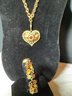 This is a gold toneheart style necklace that is enhanced with fall colors like amber, gold and rusty red. The heart sits on a rollo style chain. Size: The heart measures 1 1/2” long. The Chain is 18” long.