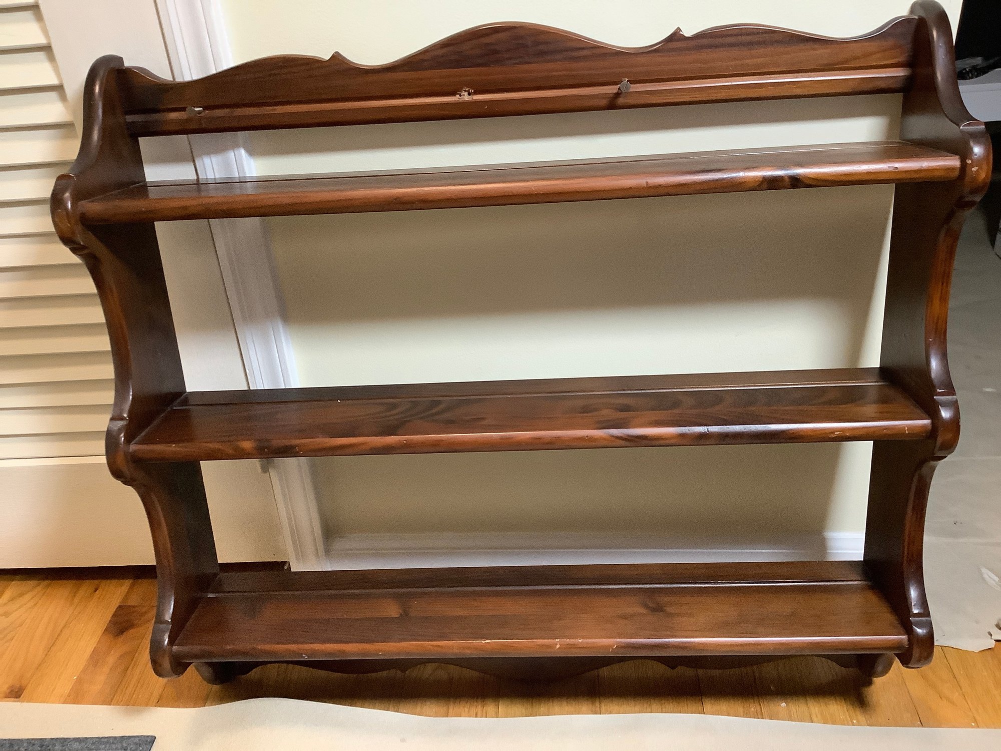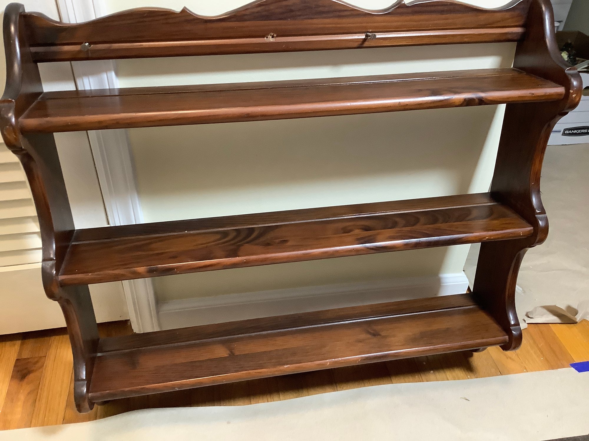 This is a shelf used to display decorator plates. It has the grooves for the plates to be displayed properly.