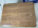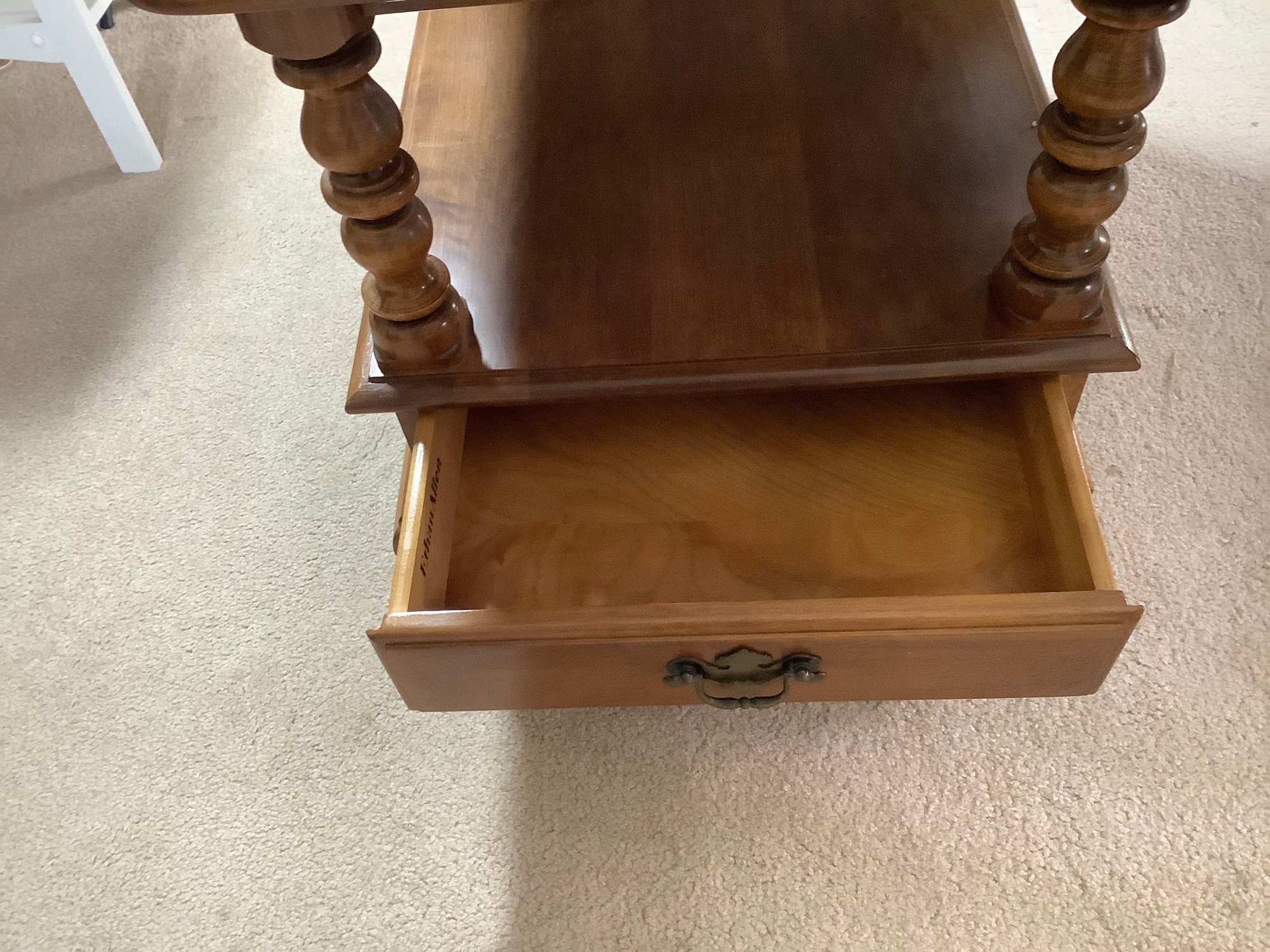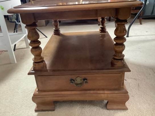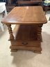 Solid wood table has a pull out bottom drawer with storage on top.