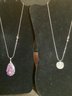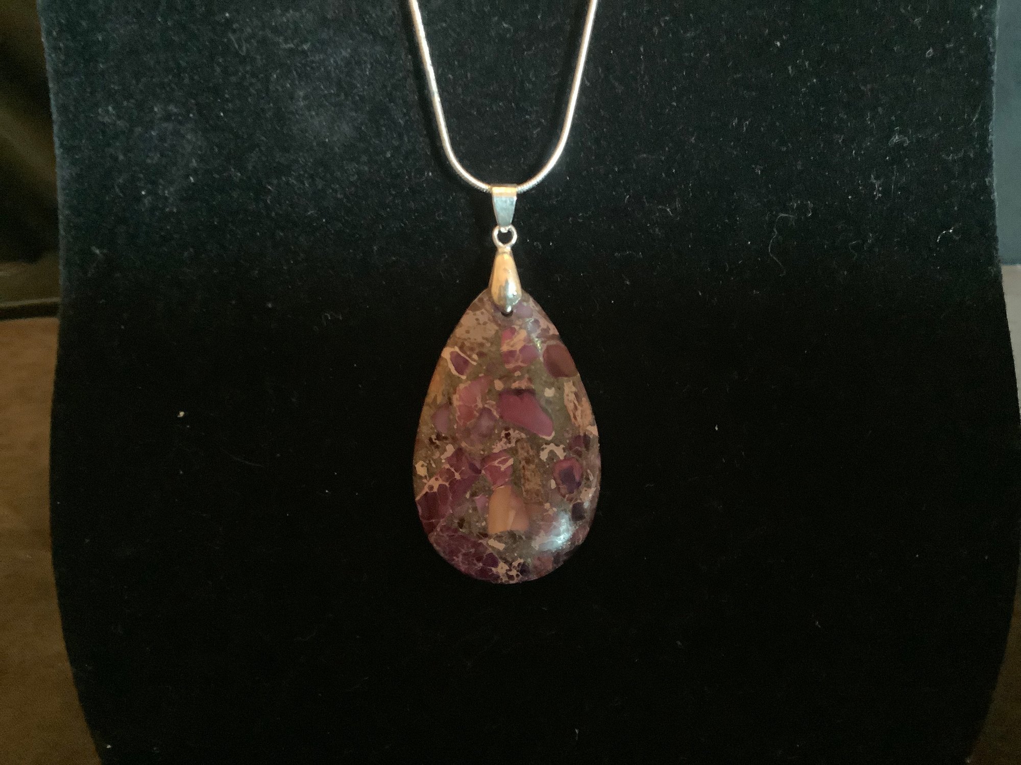 1.) Lapis Lazuli pink and purple stone is unmarked. Has a nice sturdy bale hangs about 2” long on a 19 1/2” chain.