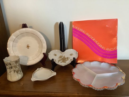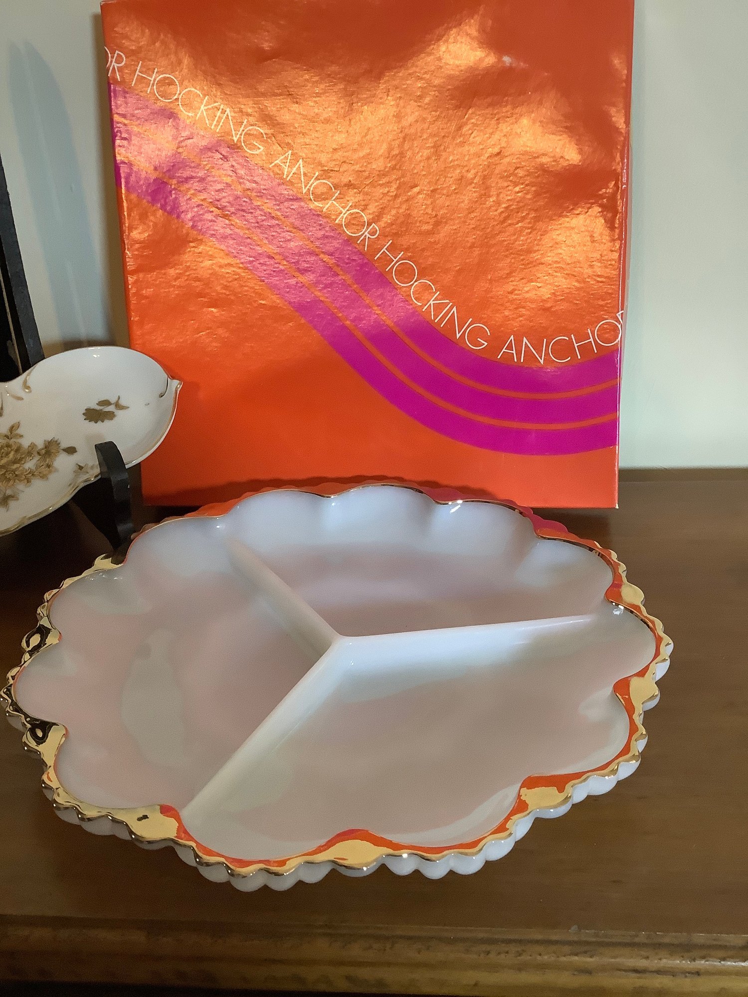 1.)New- Old stock. Vintage Anchor Hocking Divided Dish with heavy gold rims. We have the box!
