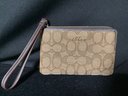 The rectangular shape, along with the Coach Signature fabric is outline is brown leather which makes this a very versatile piece in your wardrobe-easy to dress up or down. Also perfect for evening ware, travel or quick trips to the store because there is room for credit cards.It zippers at the top.