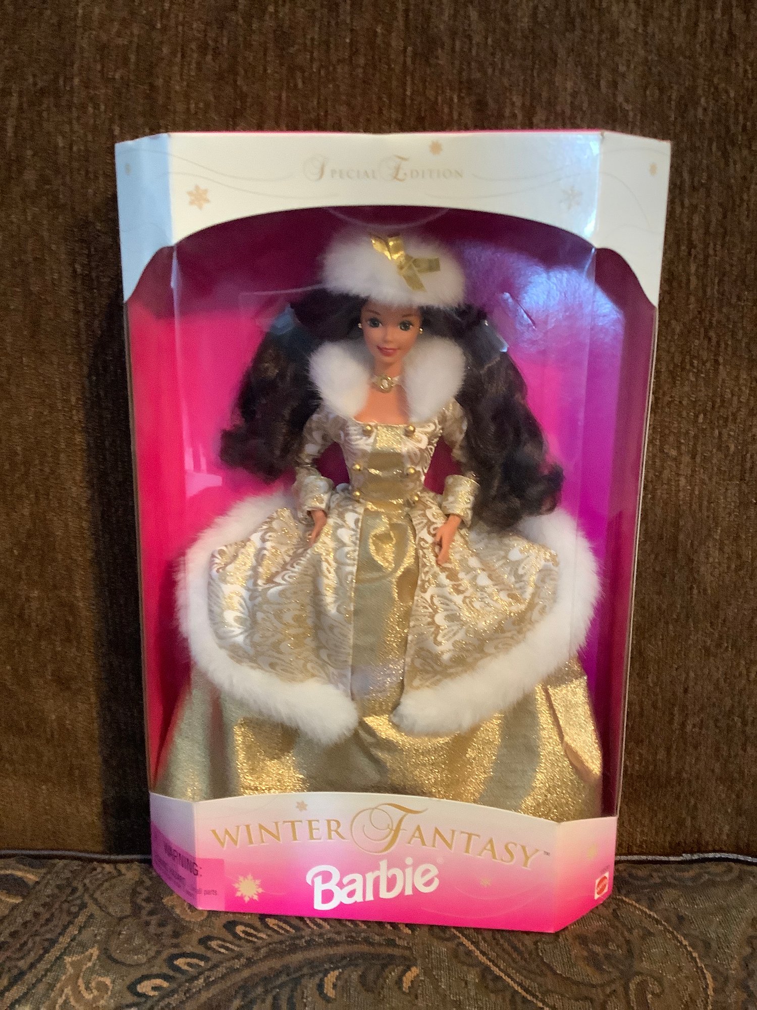 Barbie is dressed in a Gold gown. This Barbie has Brown Hair.