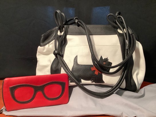 This chic pocketbook features the famed Scottie on the front. There is a double magnetic snap front pocket and a zippered pocket on the back. The interior is clean and is fully lined with division for. Pens, cell phone and a secured zipper area.