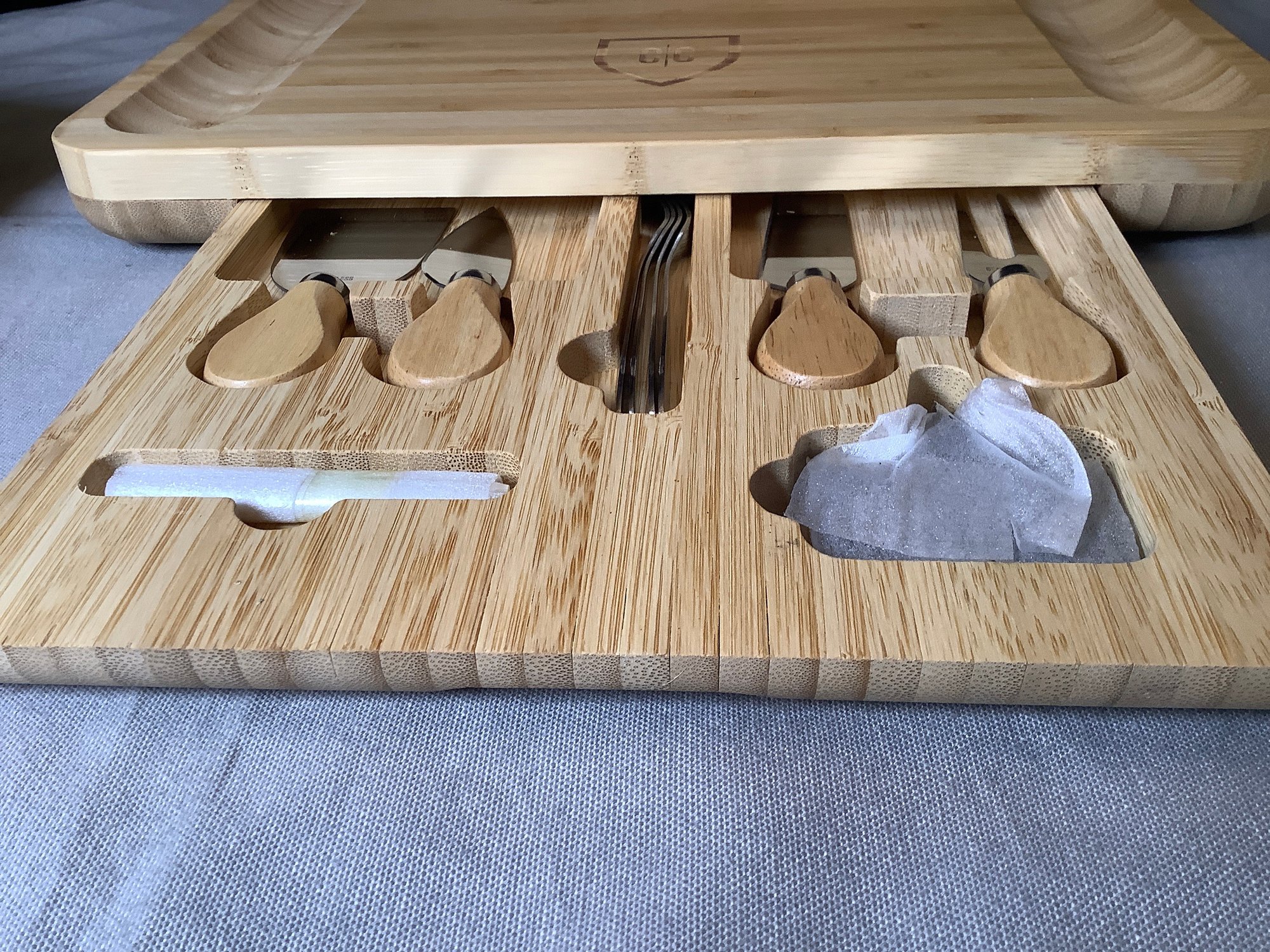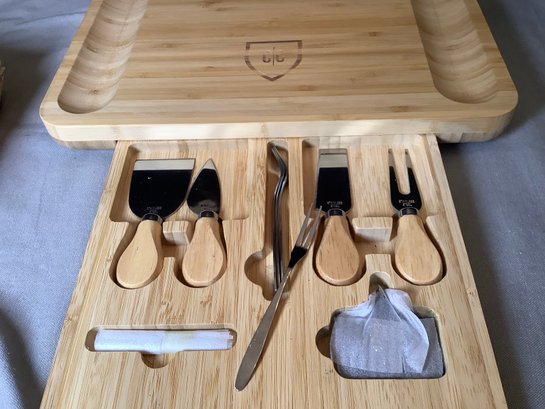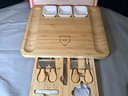 Great Set with lots of space on either side for assorted crackers, Bowls for olives or dips. Your serving pieces are nicely stowed away on the bottom.