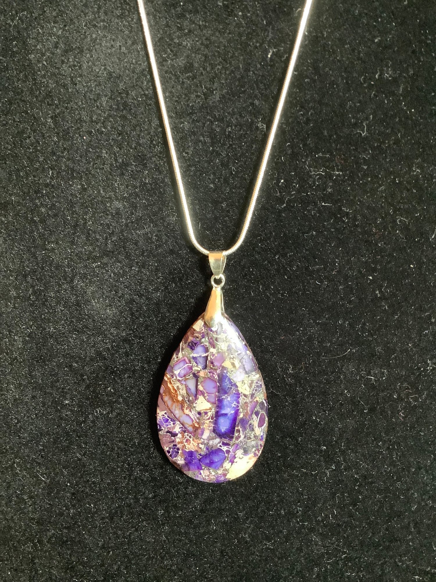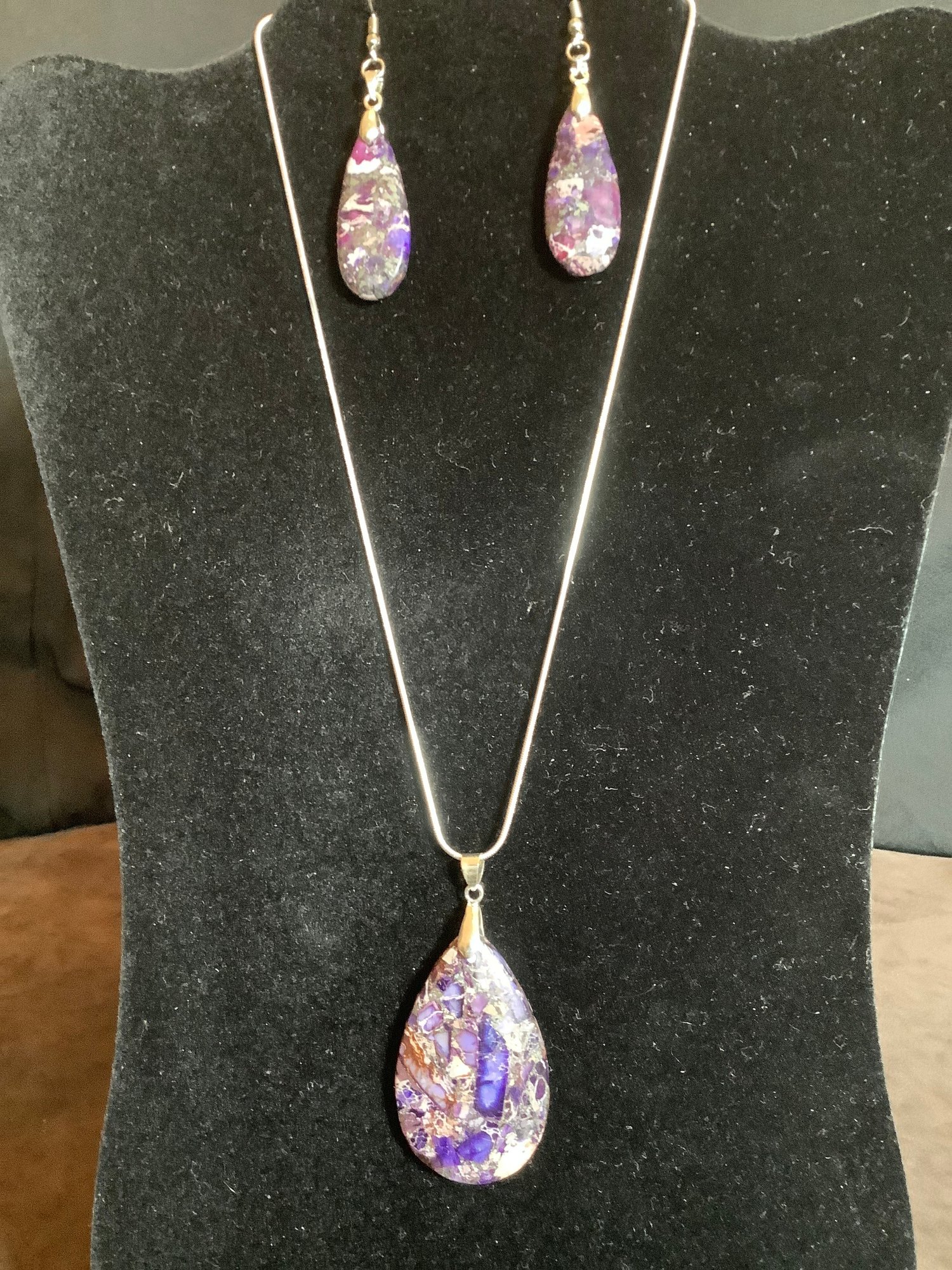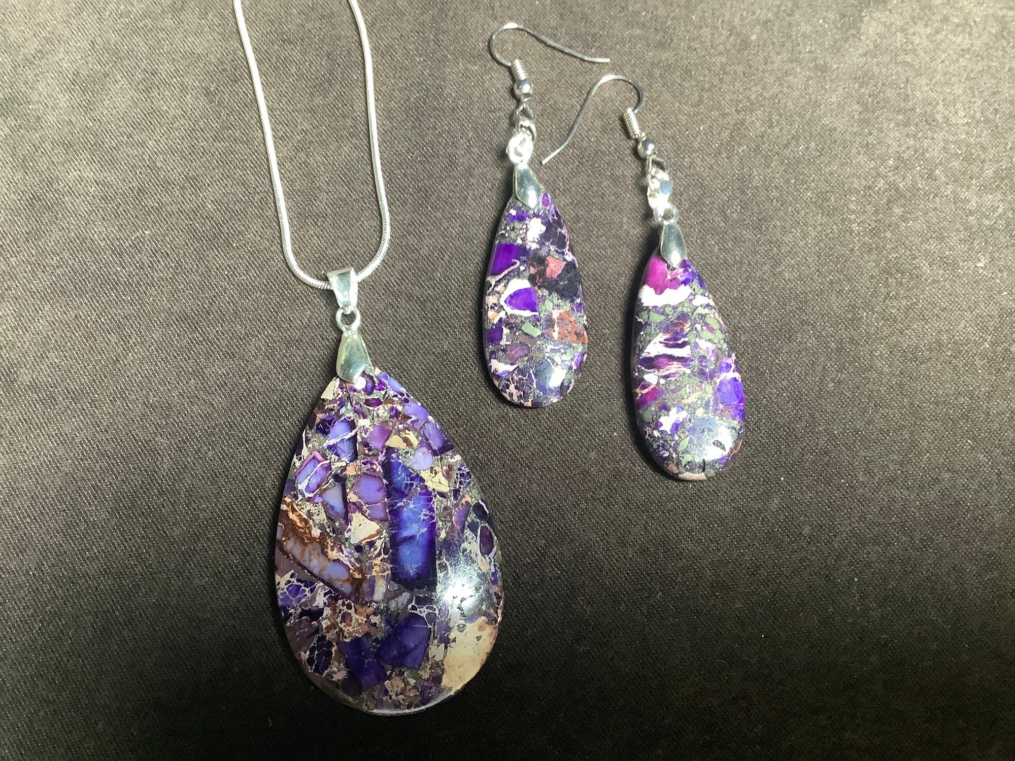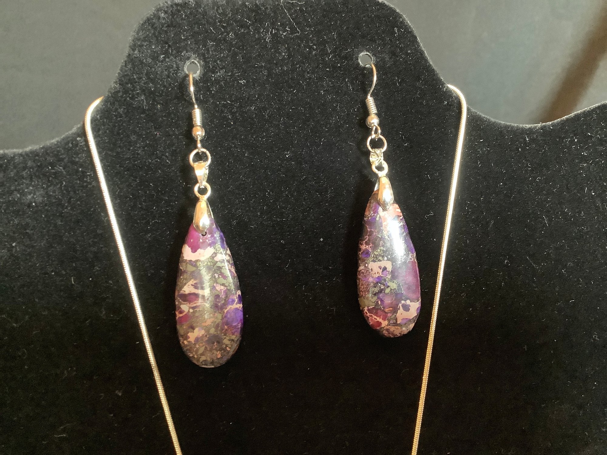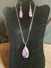 Comes with an attractive Lapis Lazuli pink and purple stone Pendant with matching drop style earrings are unmarked.