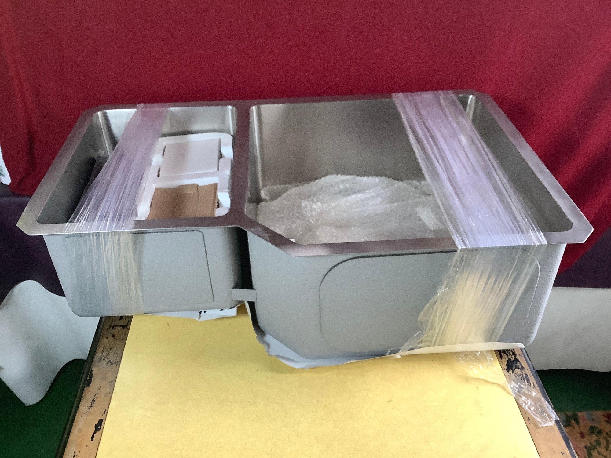 New stainless steel Dual sink by Kraus. Comes with mounting hardware, drains and bottom racks. Two sink sizes 18” x 18” x 10” deep and the second sink is 15” x 11” x 8” deep. Insulted out sides. Photos are part of the description. NO SHIPPING
