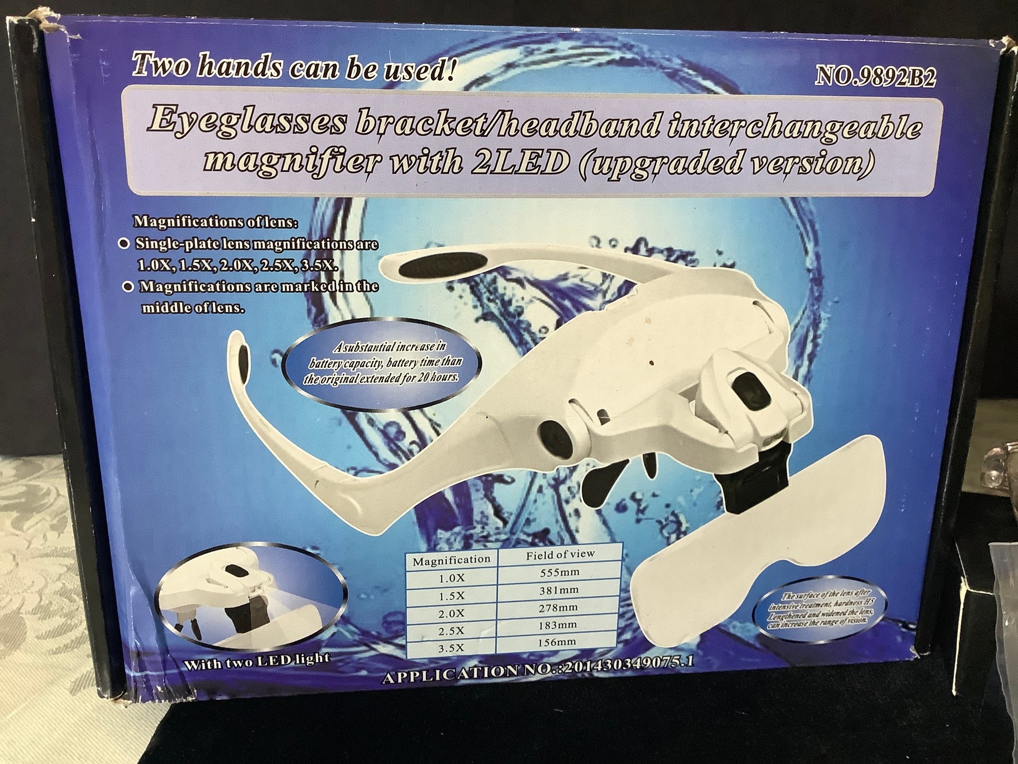 An eyeglass bracket/headband that has an attached magnifier that can be adjusted for distance and length.