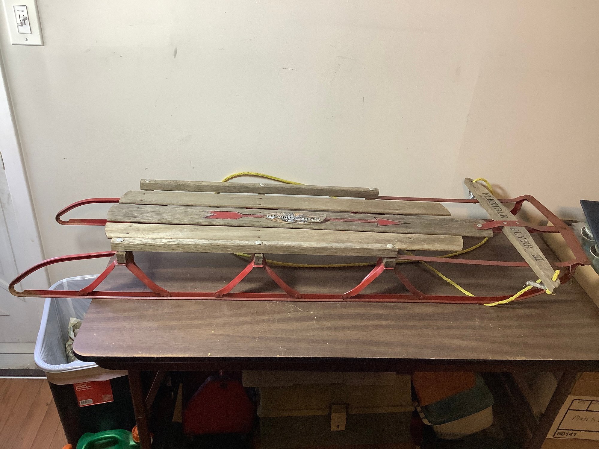 Flexible Flyer Sled. Photos are part of the description. Size approx. 54” x 13”. Needs refinishing. NO SHIPPING!!!!!!
