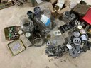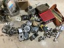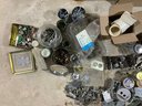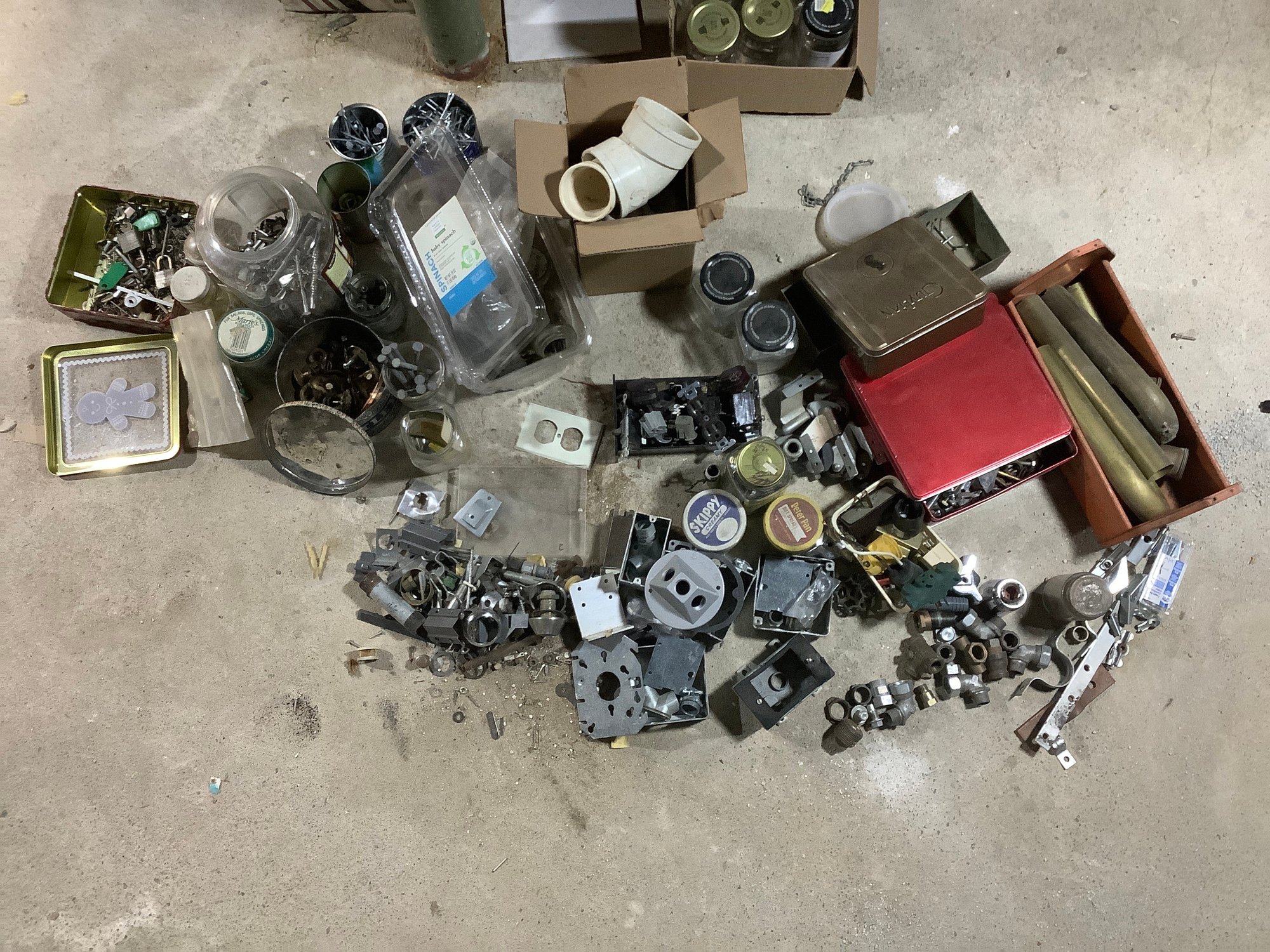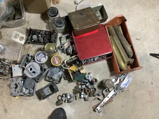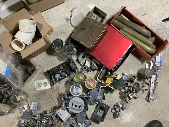 Floor full of miscellaneous hardware. Includes Pipe fittings, electrical, plumbing, nails and screws and more. Photos are part of the description. Preowned. NO SHIPPING. Bring boxes. Located in basement.