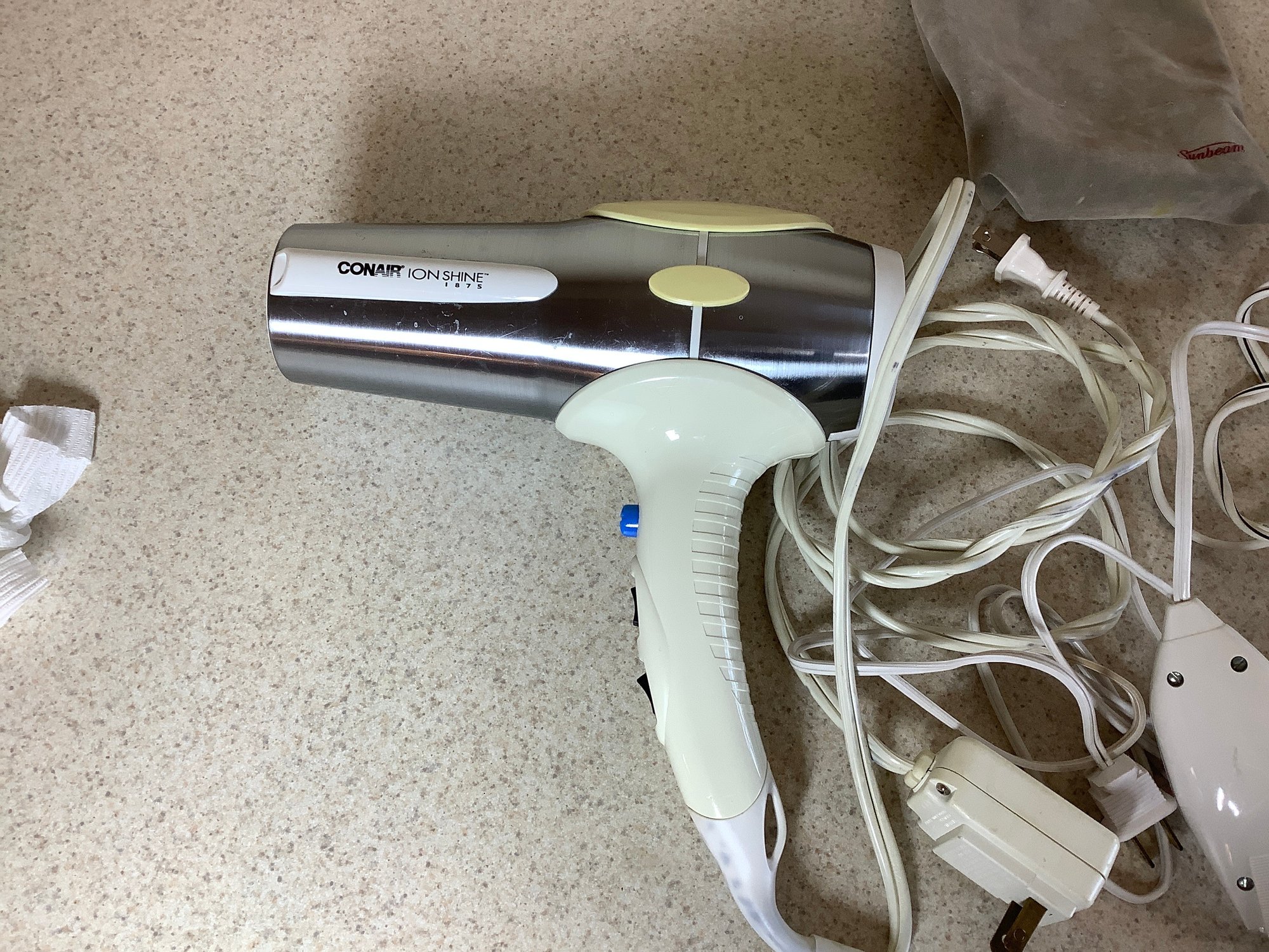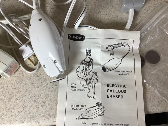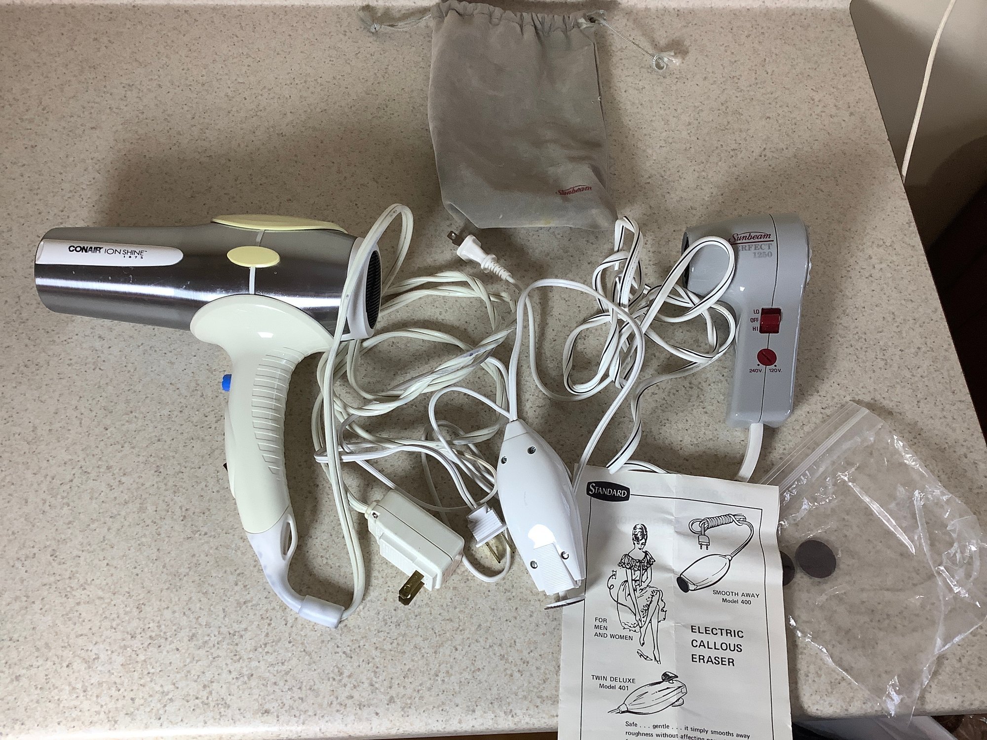 Hair dryers and callous eraser . Incudes CONAIR, Sunbeam and Standard Prod callous remover. All in working condition. Photos of part of the description. Preowned..