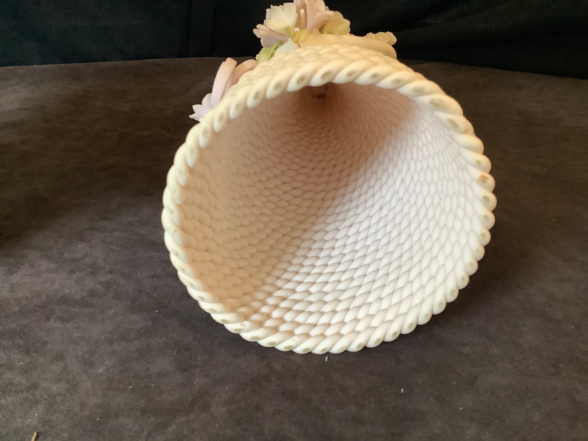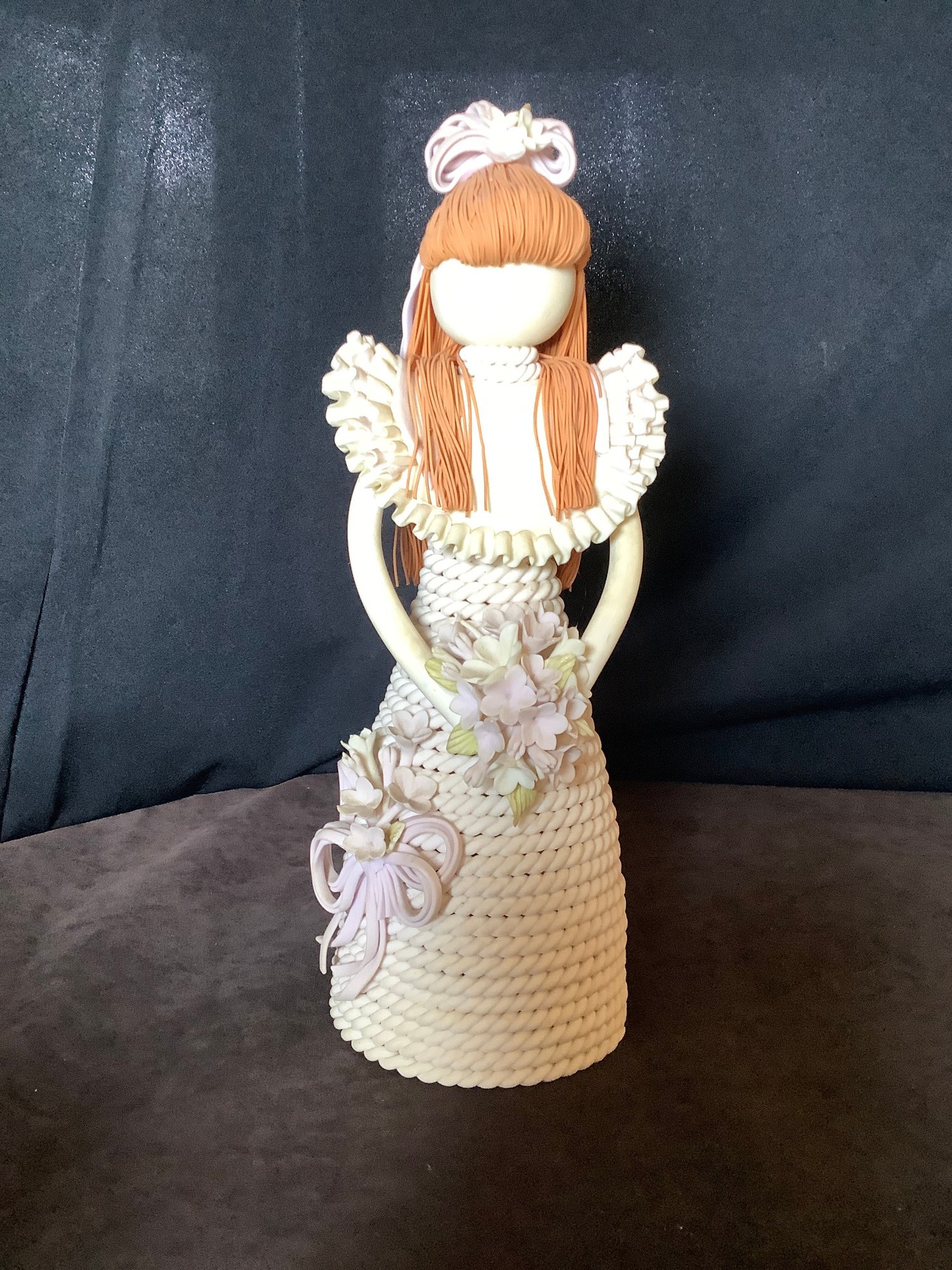 Details include a rope style dress and bodice. This little lady is carrying a bouquet of flowers with a matching floral bundle on her dress and in her hair. She is all almost all one color with faint highlights in her flowers and strawberry blond hair.