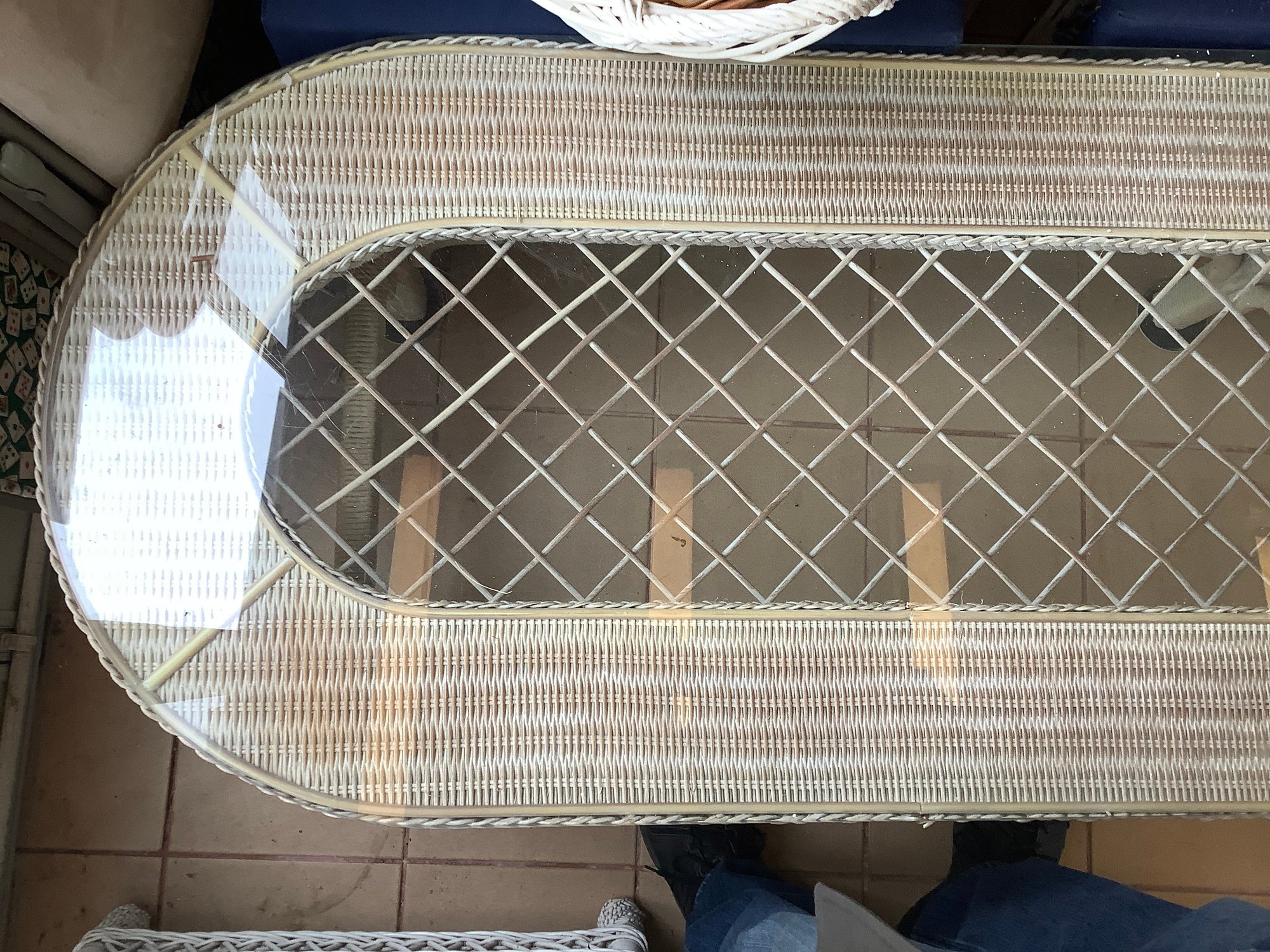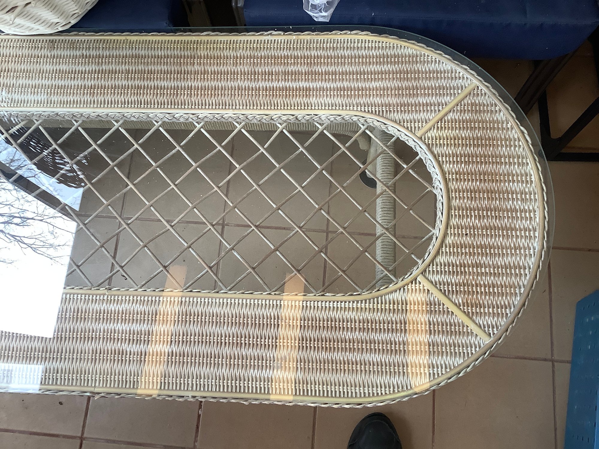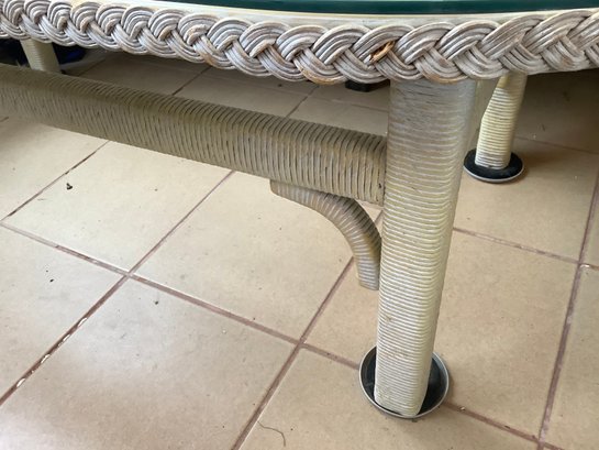 Henry Link Wicker rattan glass top table. Size 54” x 25” x 17” tall.