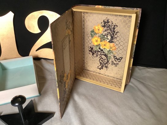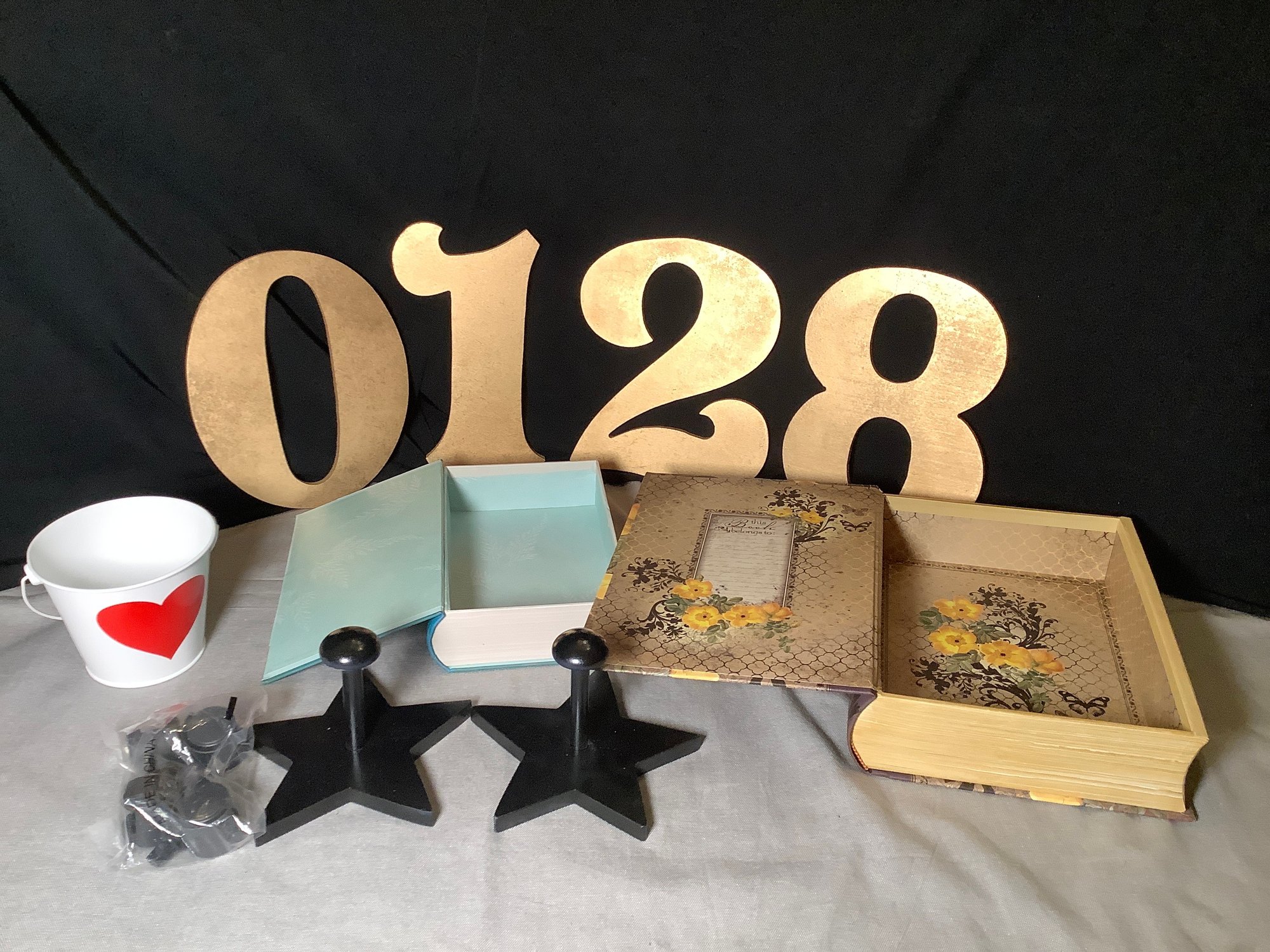Home decor. Includes 4 numbers, 2 hat hooks, 2 storage book boxes and small heart pail. Photos of part of the description. Preowned. NO SHIPPING!