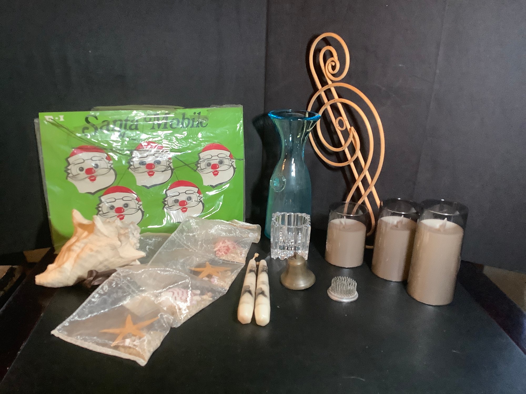 Assortment of home decor. Including sea shells, candles, Santa Mobile, bell, Vase, lights and more. Pre-owned. Photos are part of the description.