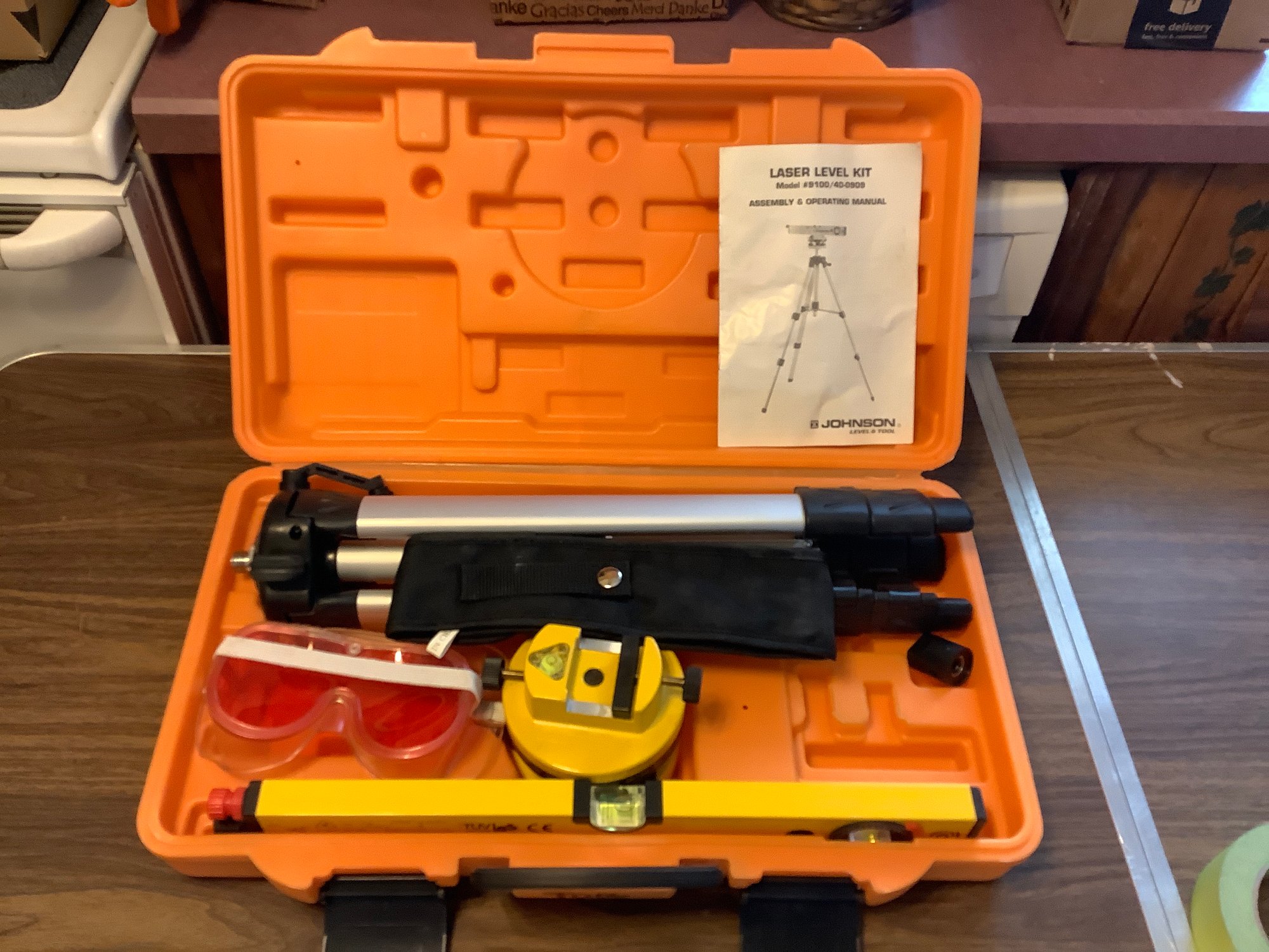 Johnson Level & Tool Laser Level Kit . Model # 9100/ 40-0909 in plastic storage case. Preowned and untested. Photos are part of the description.