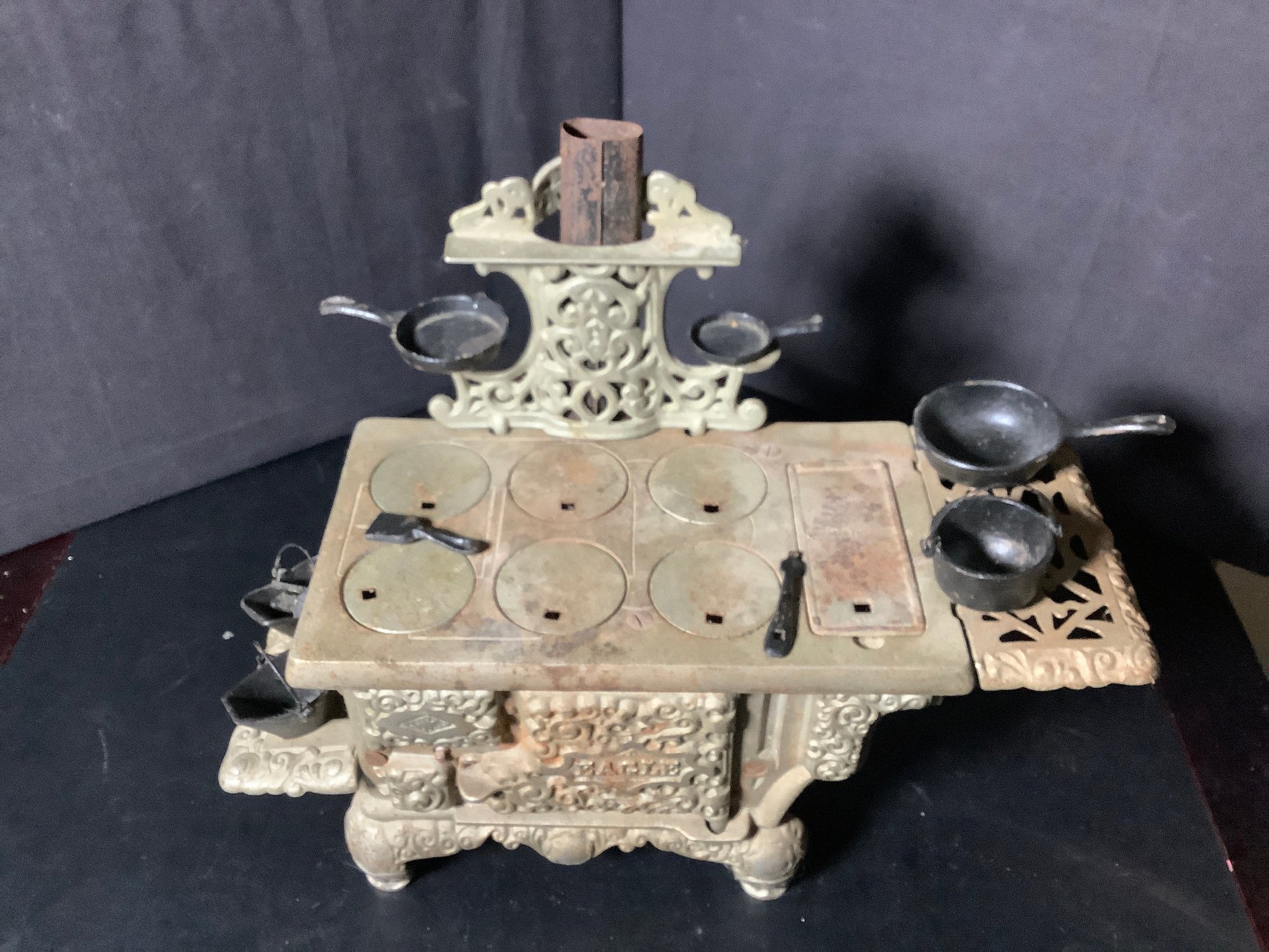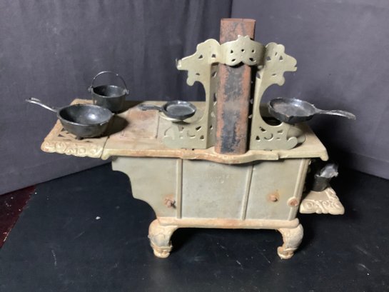 Lancaster Brand, Eagle cast iron stove . Salesman sample. 16” wide. Comes with Accessories. Photos are part of the description. Preowned.