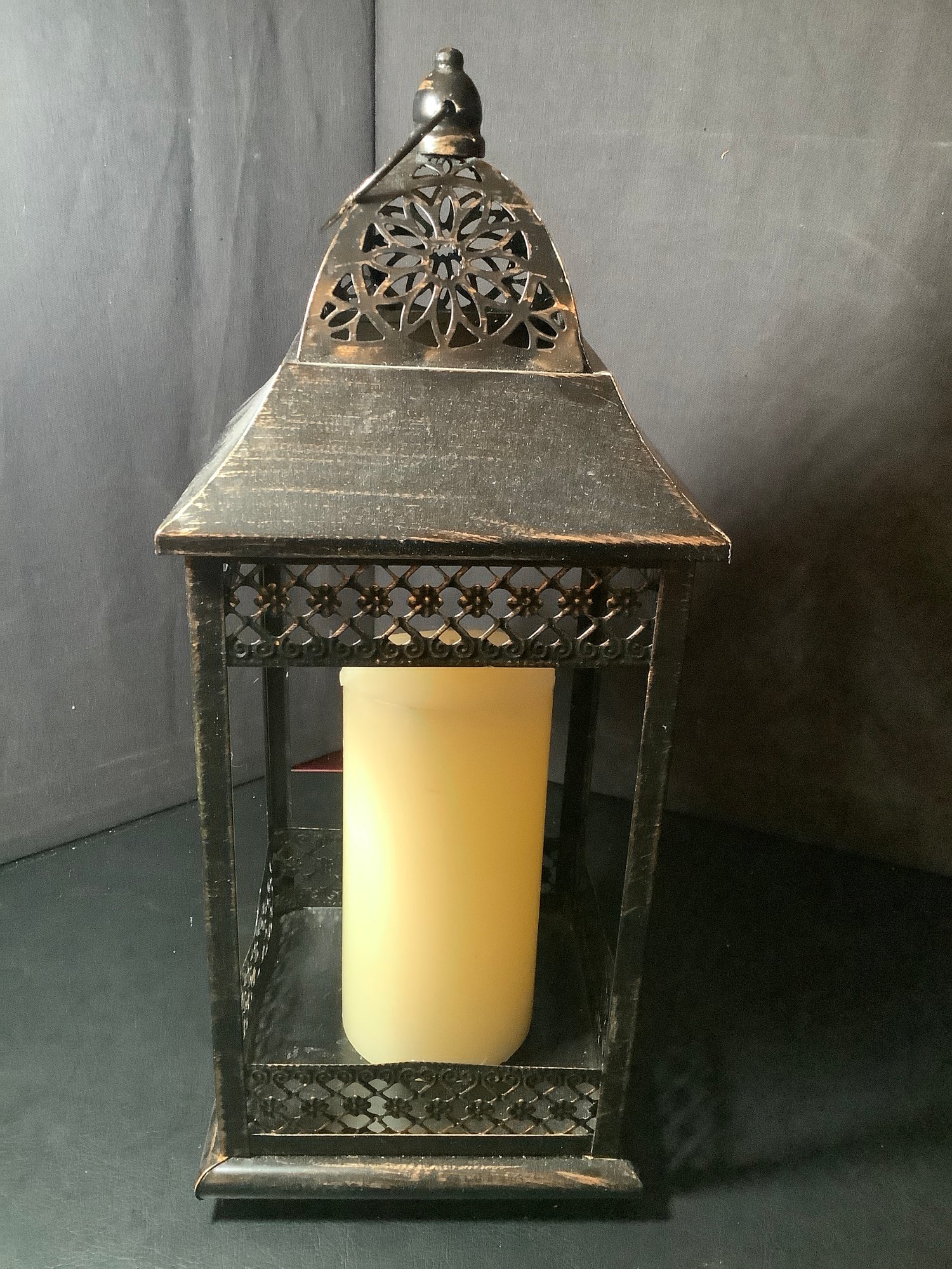 Lantern style candle holder with candle. Size 6” x 6” x 15” tall. Never used. Photos are part of the description.