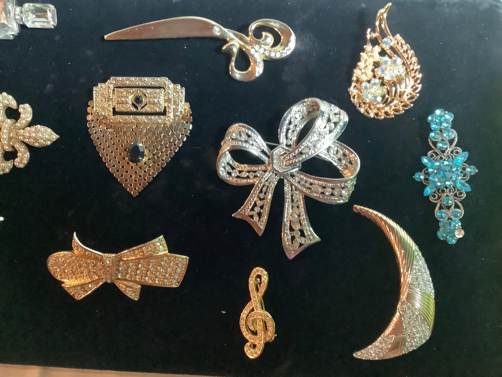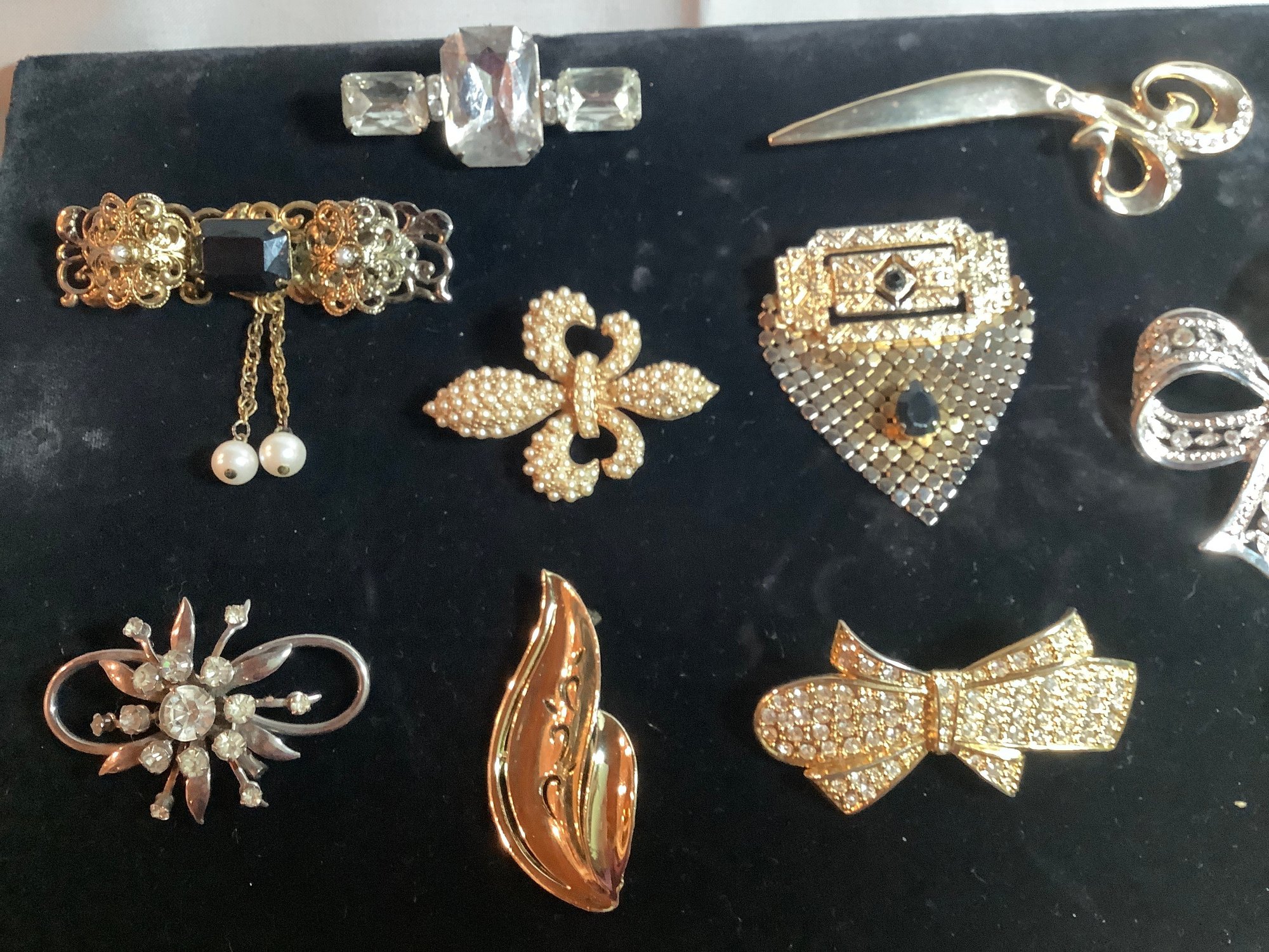 There are shiny pins (and Brooches), one with faux pearls, dangling pins, glittery pins and oh what shine!