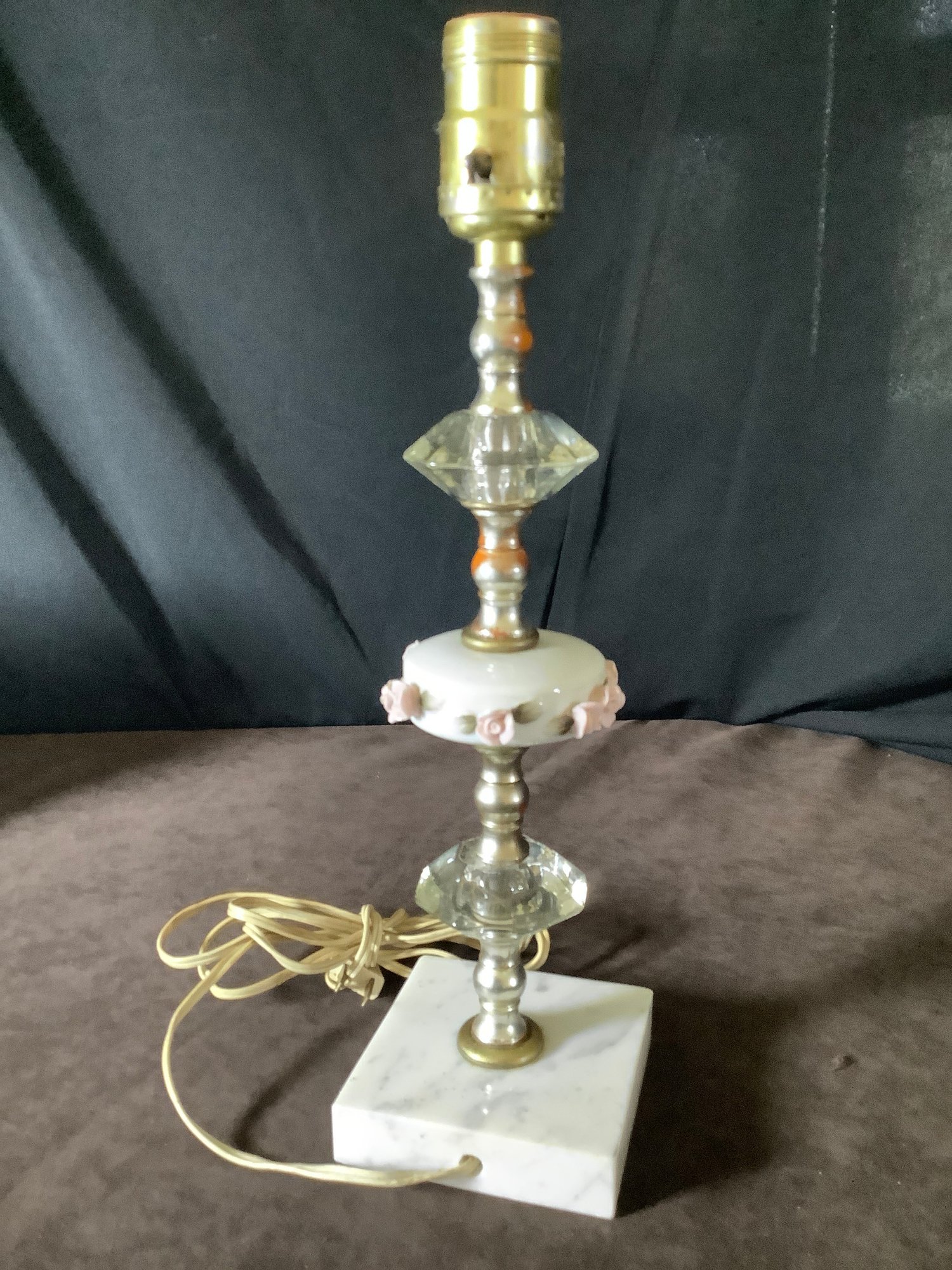 It features a marble base with lucite and has intricate pink porcelain flowers in the center of the stem.