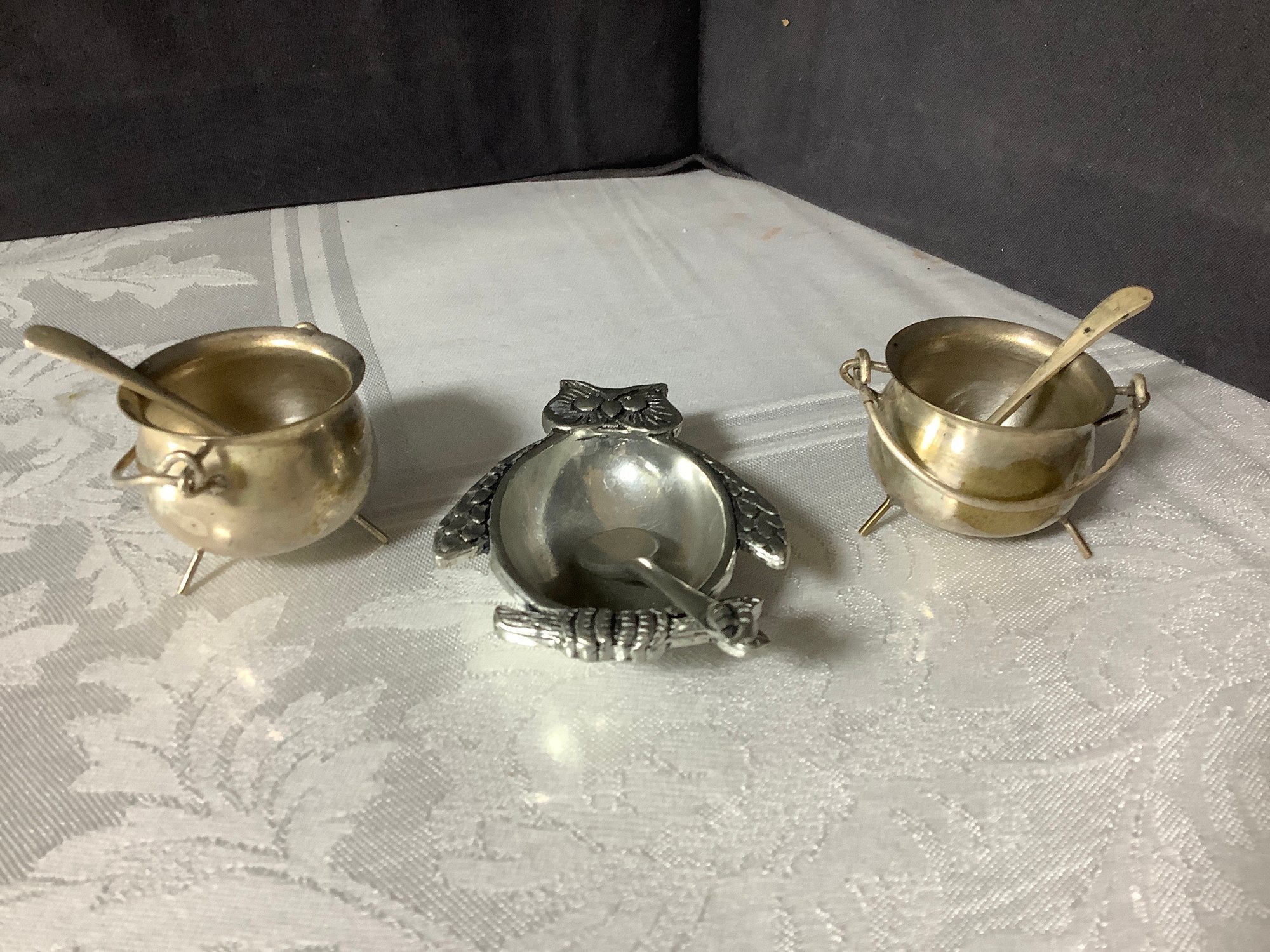 Matching pair of bucket style salt cellars with the matching spoons. Additionally we have a Pewter Salt Cellar in the shape of an owl.