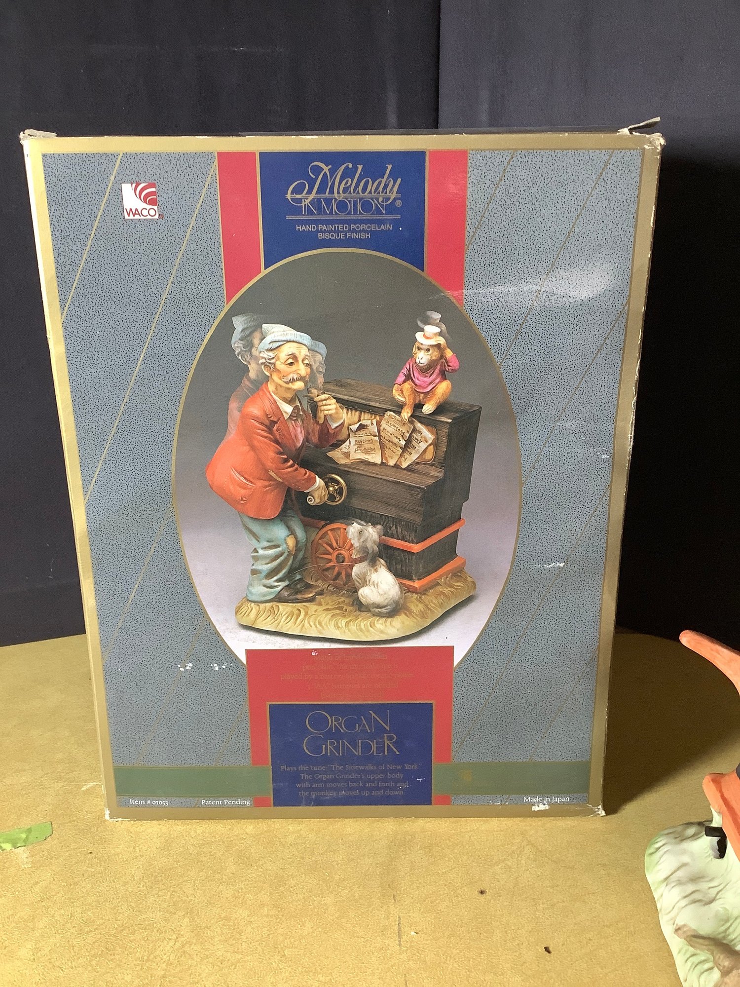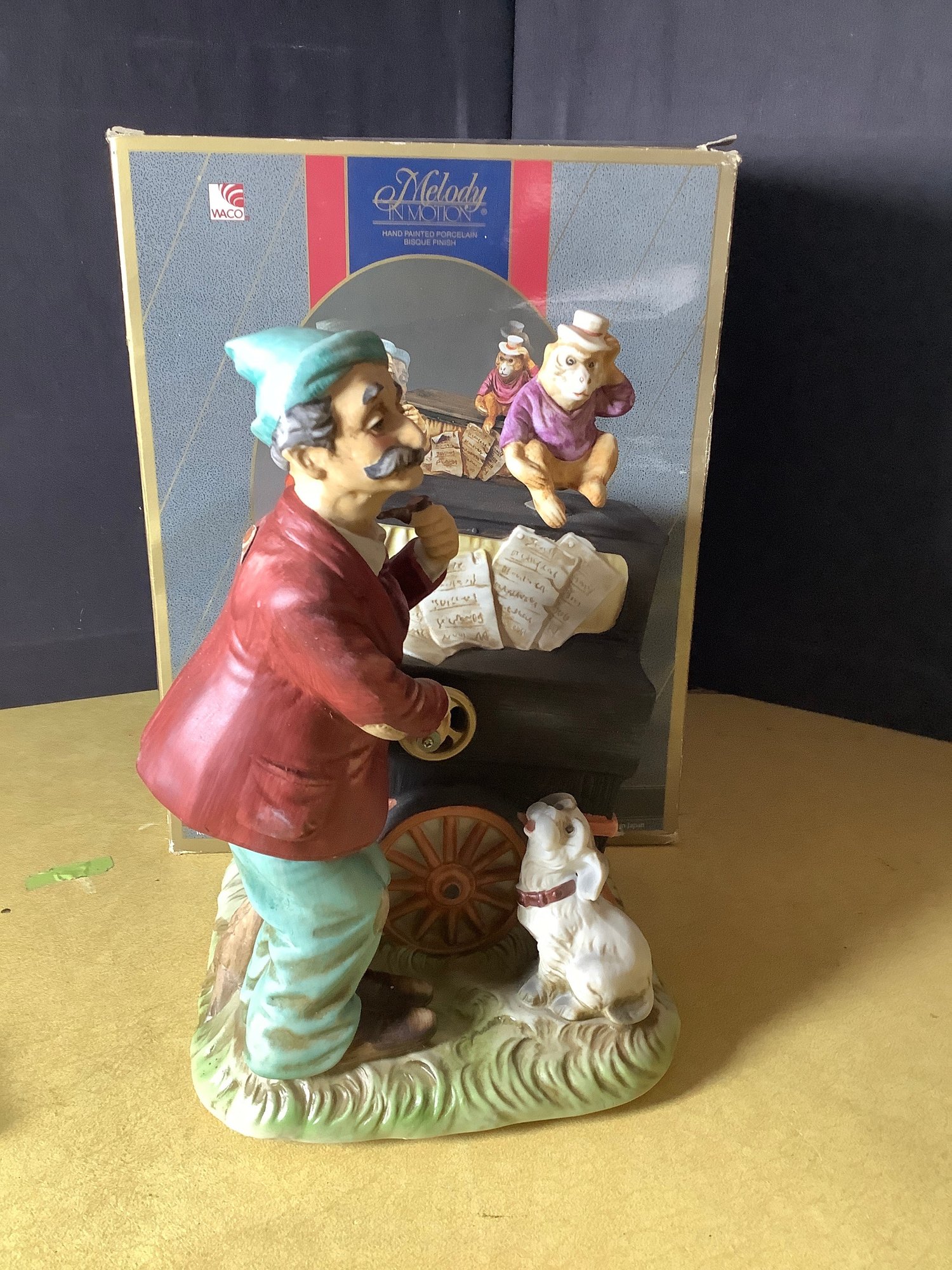 Vintage Melody In Motion hand painted porcelain bisque finish figurine. Organ Grinder. Stand approximately 10” tall. Box has wear. Photo are part of the description. Preowned and untested. NO SHIPPING.