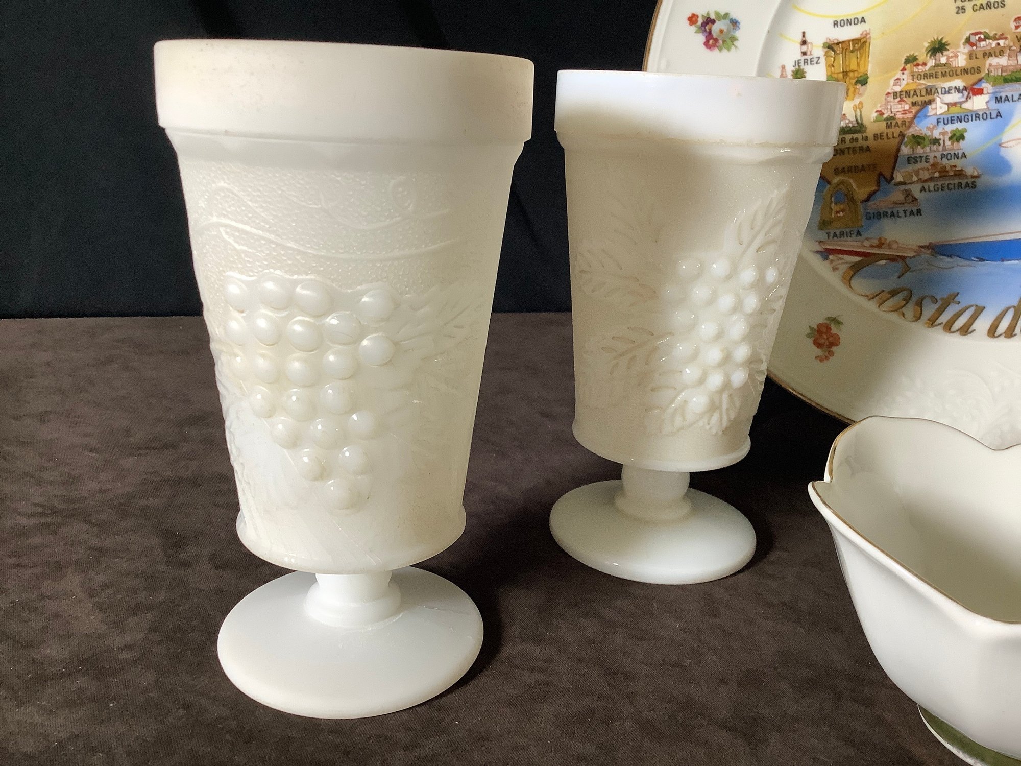 Stemmed Milk glass, bowls, Costa Del Sol Souvenir plate.