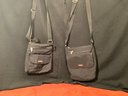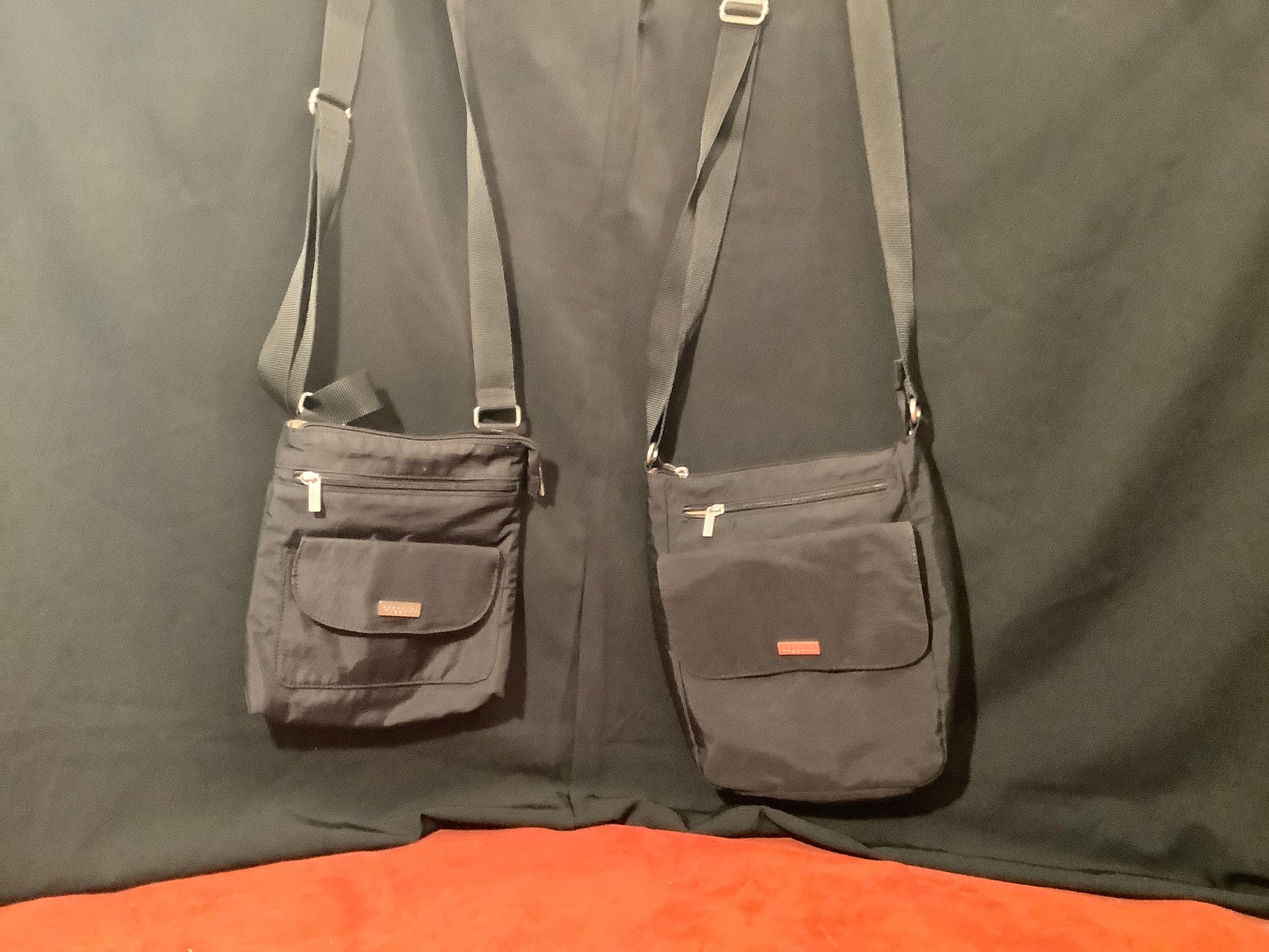2.) With black front pockets, zippers at the top and adjustable cross body straps.