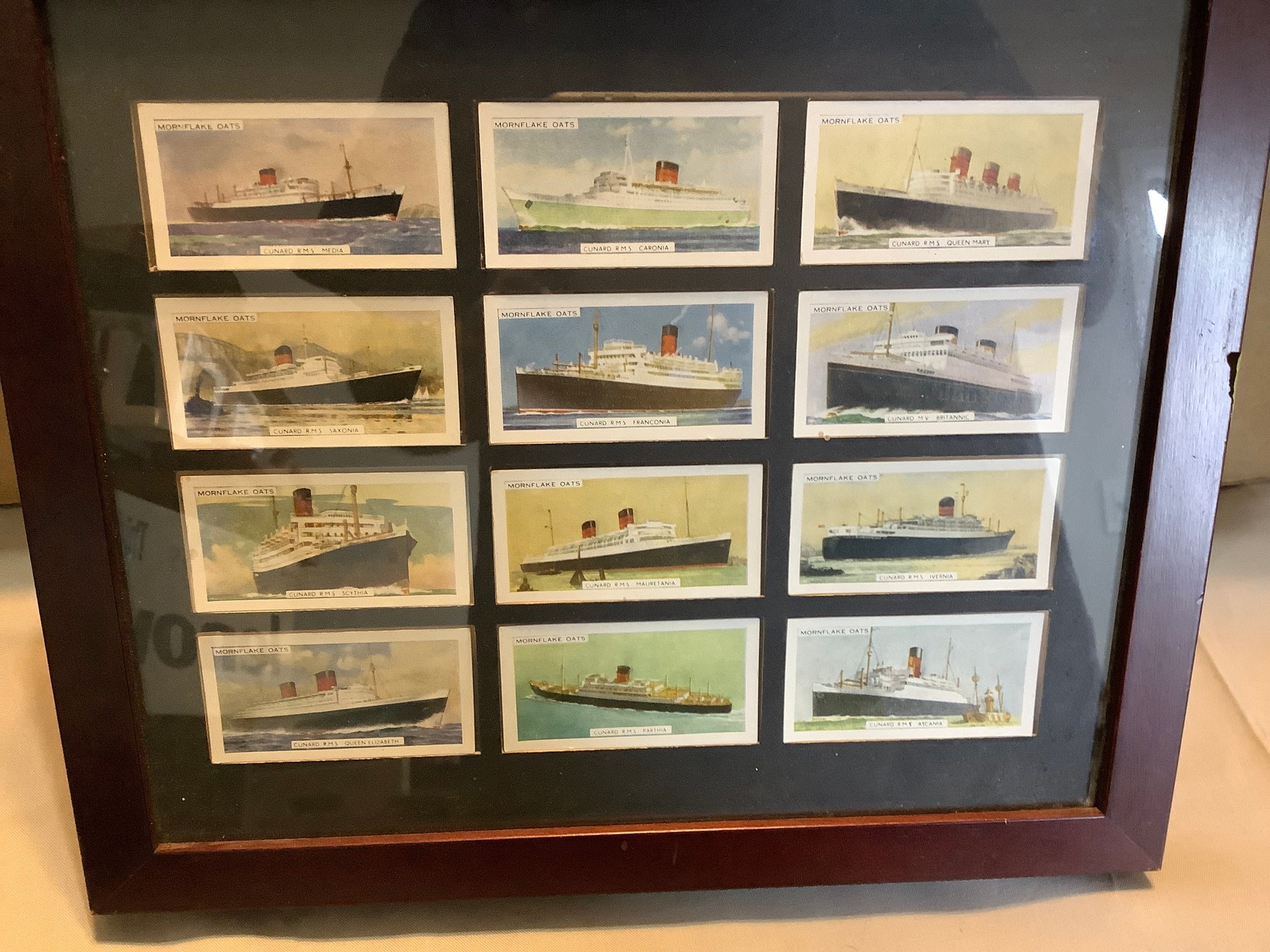 Framed collection of Mornilake Oats Cunard Ocean Liner cards. These cards are from Mornflake Oats boxes. Photos are part of the description.
