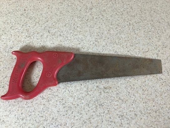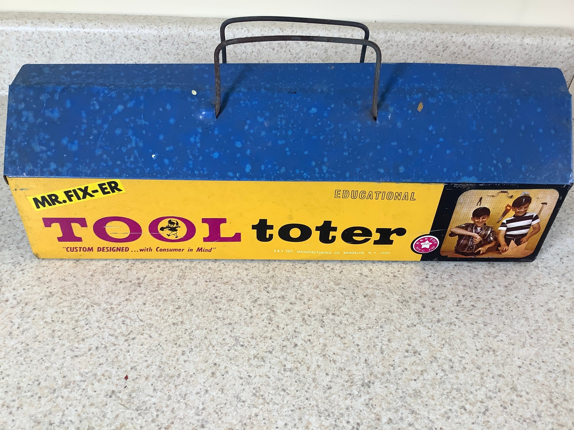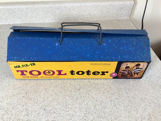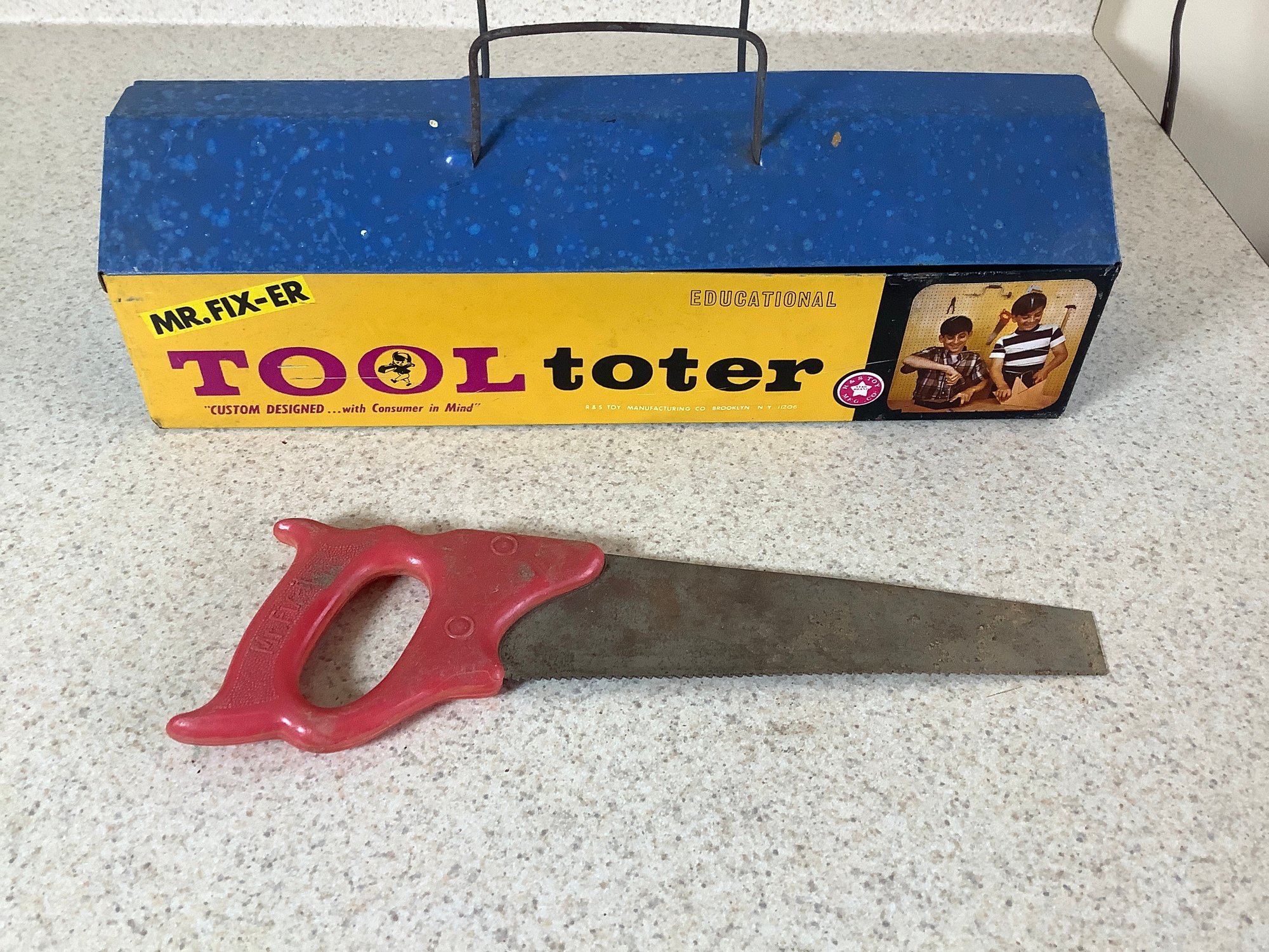 Mr -Fix-er toy Metal tool box and saw. Box size 14” x 5” x 4-1/4” high. Photos are part of the description. Preowned. NO SHIPPING