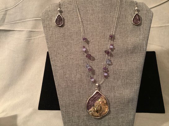 This is n illusion style necklace with multi colored stone from pale lavender to purples. There is a gorgeous pendant that hangs just enough to enhance the neckline. The necklace is adjustable.