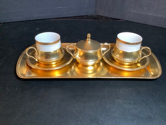Gold tone demitasse/ expresso set. New without box . Has been displayed. Includes 2 cups and saucers, sugar bowl and tray. Photos are part of the description.