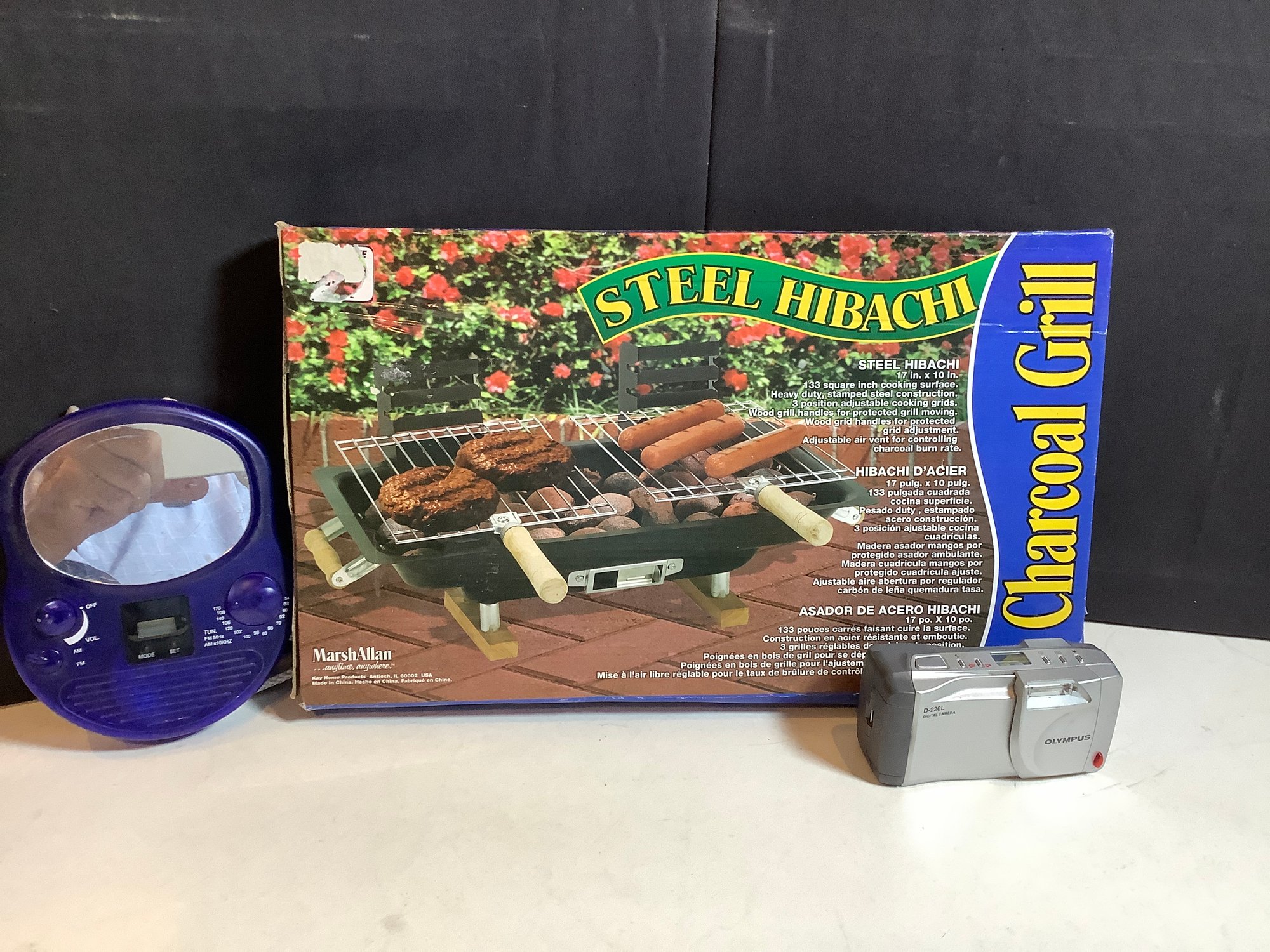 Outdoor party lot . Includes Olympus camera, Radio and Steel hibachi. All electronics are untested and preowned. Hibachi new in box. Photos are part of the description. No shipping