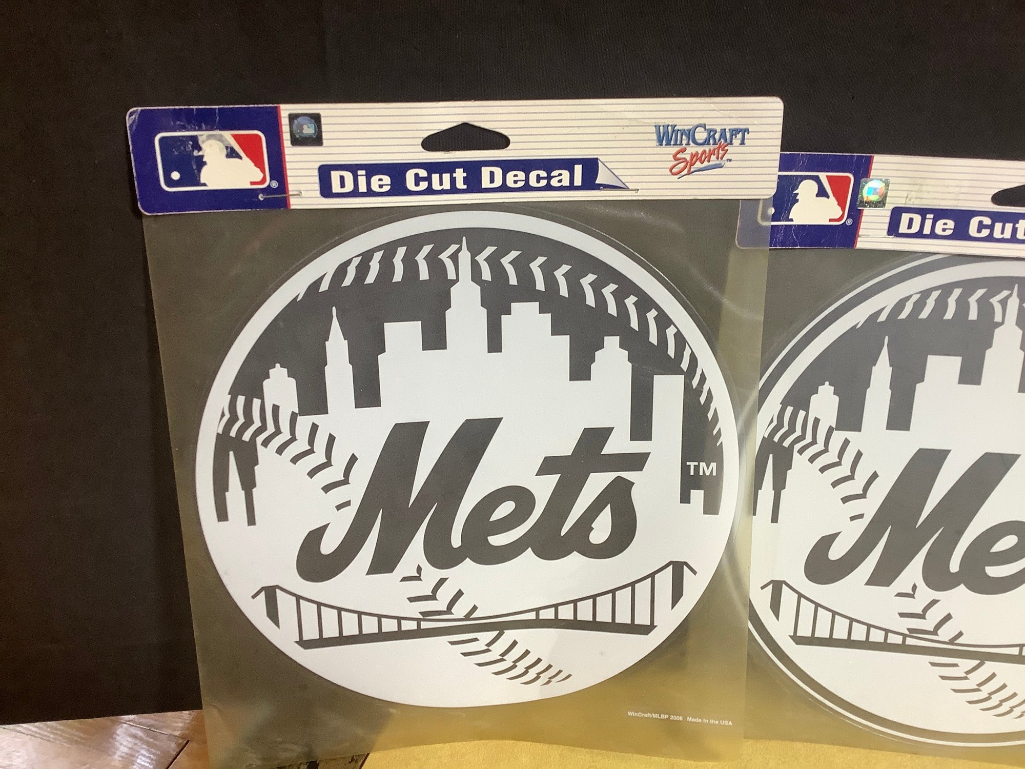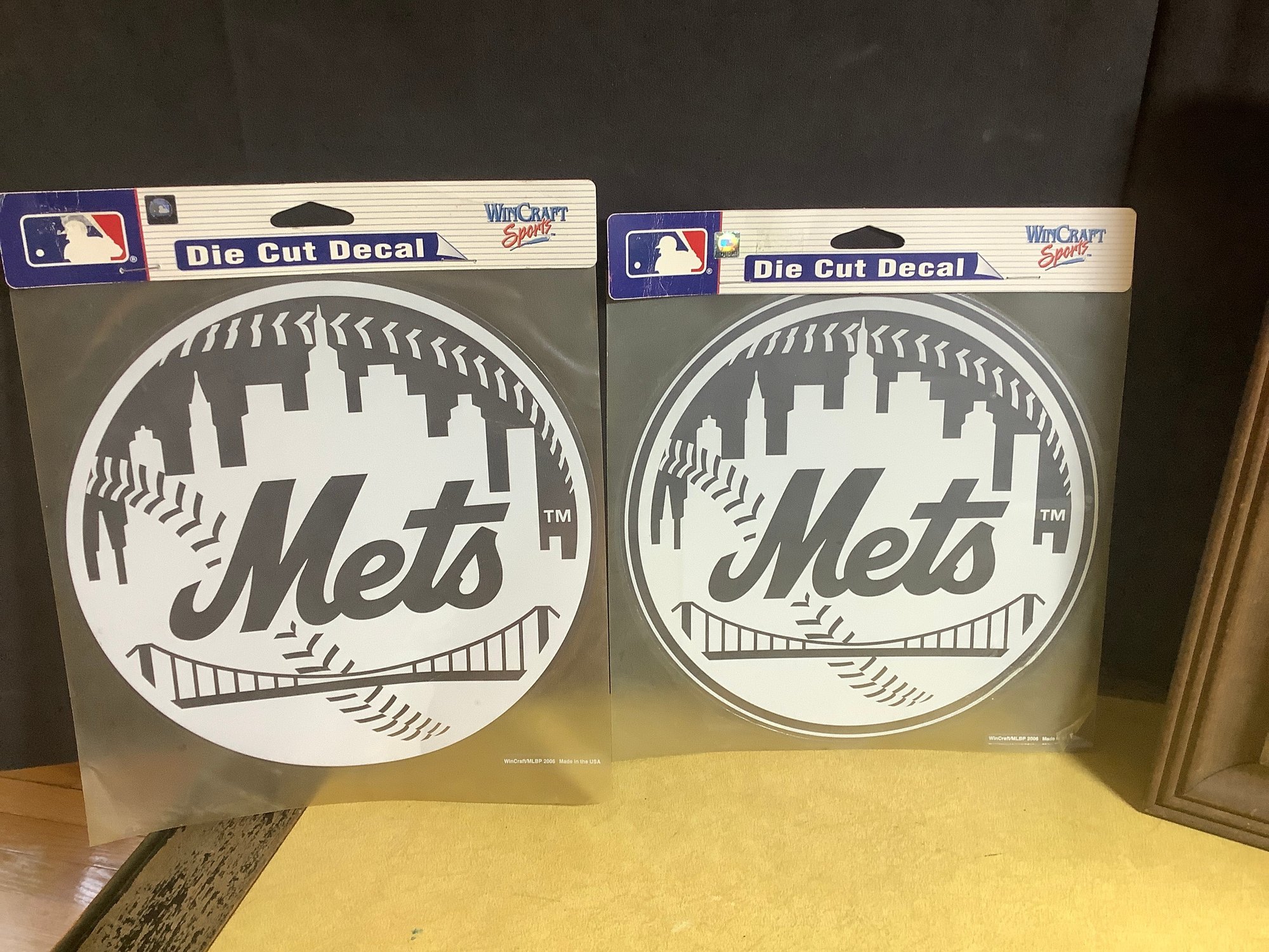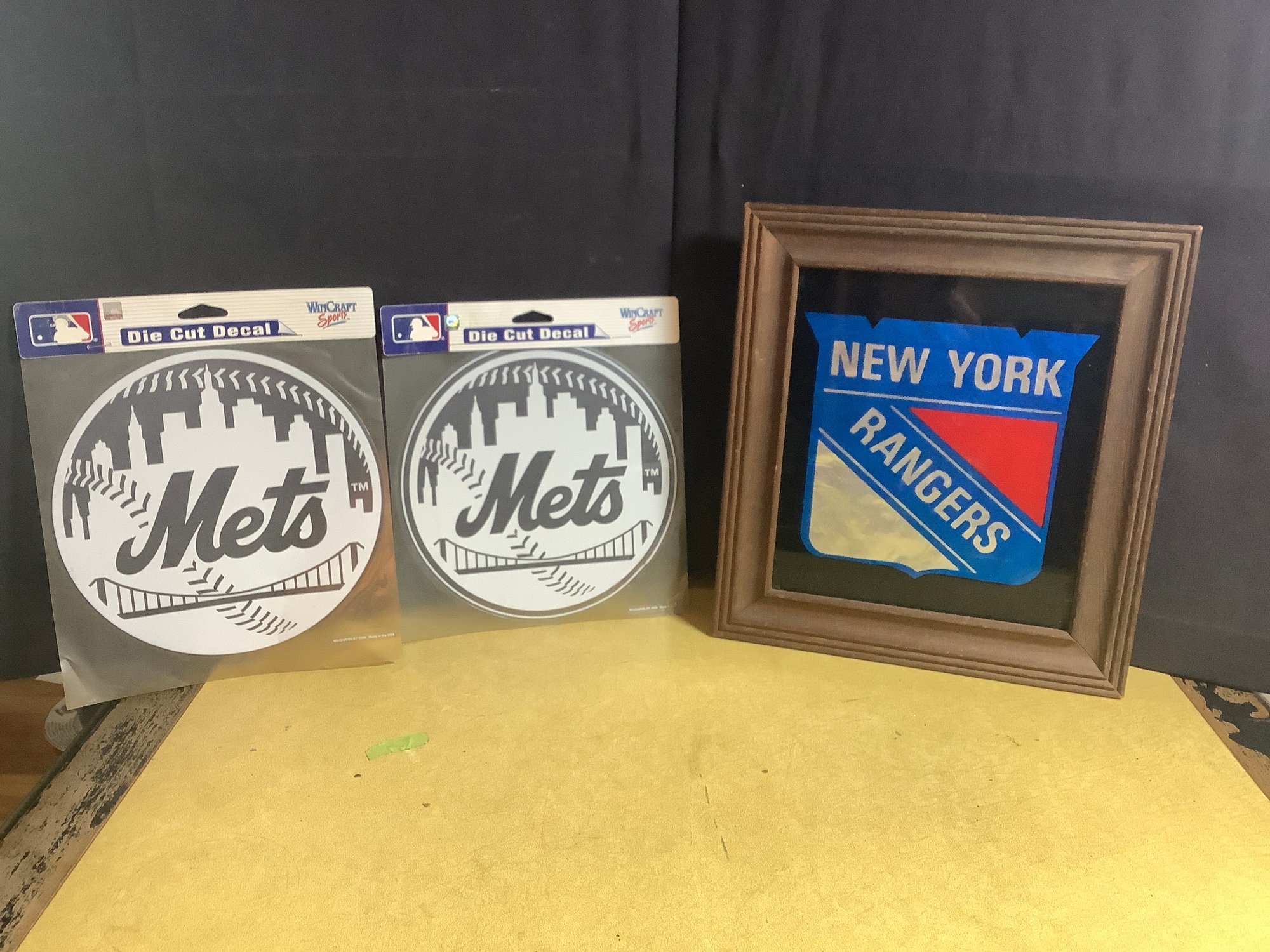 Rangers wall plaque and 2 Mets decals. Rangers is plaque 10” x 11”. Mets decals 7-1/2” round. Photos are part of the description. Preowned.