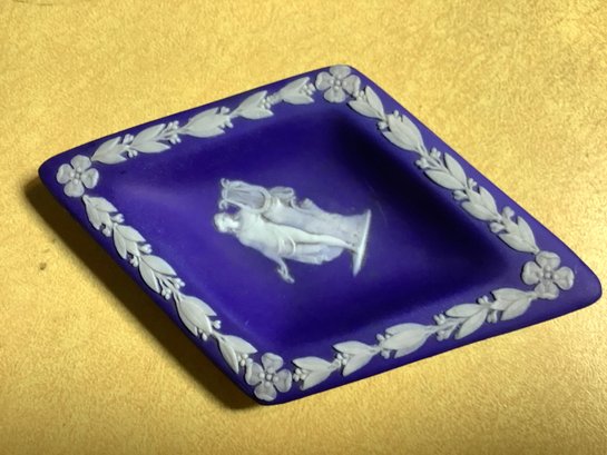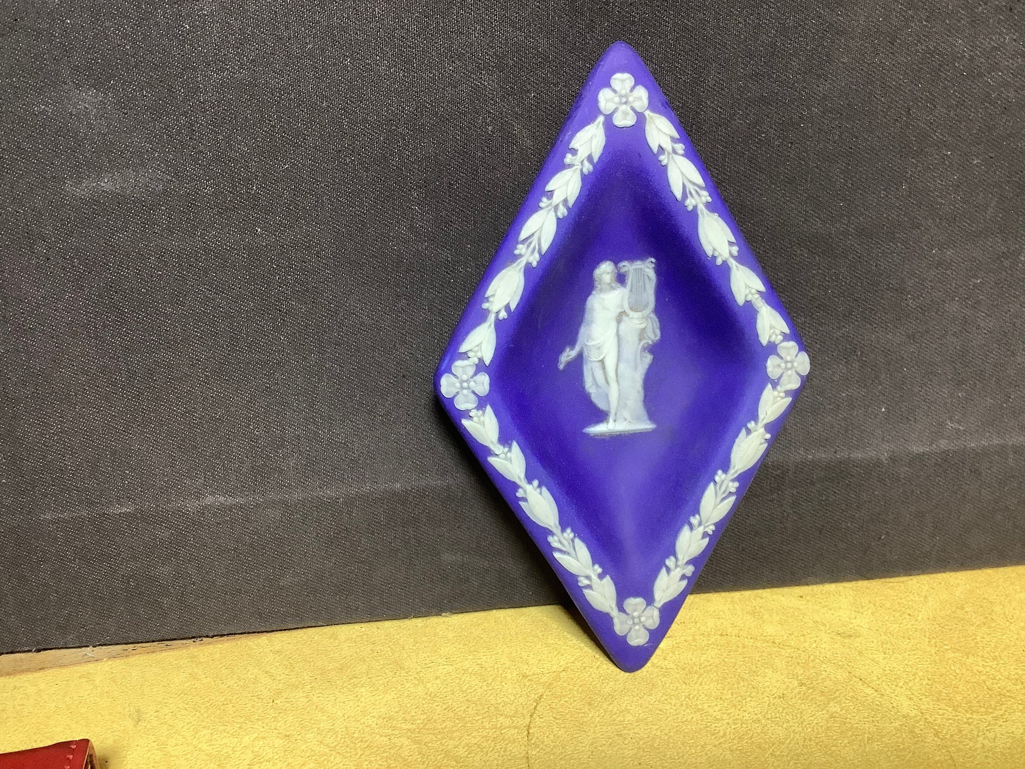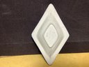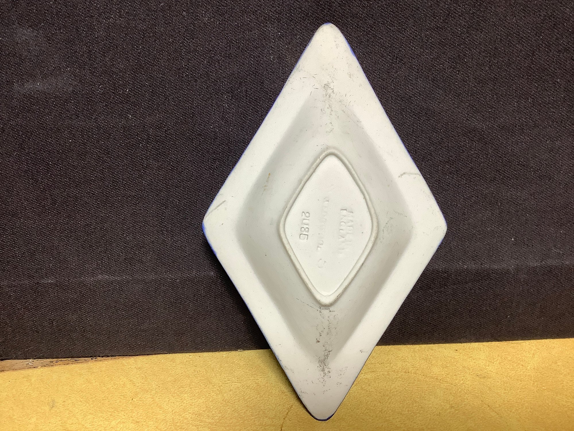 This is a diamond shaped dish that measures 3 1/2 across x 5 3/4 long. It depicts someone playing a harp.There is no box.