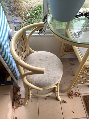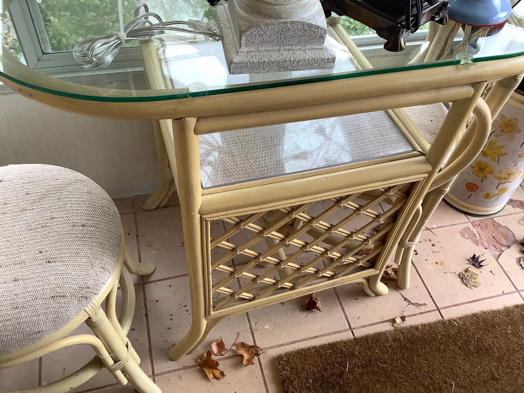 Rattan wicker table with 2 chairs. Table has glass top size 40” l x 21” w x 31” high. Chair 21” x 17” x 28” tall. Photos are part of the description. Preowned. NO SHIPPING. Bring help to move.