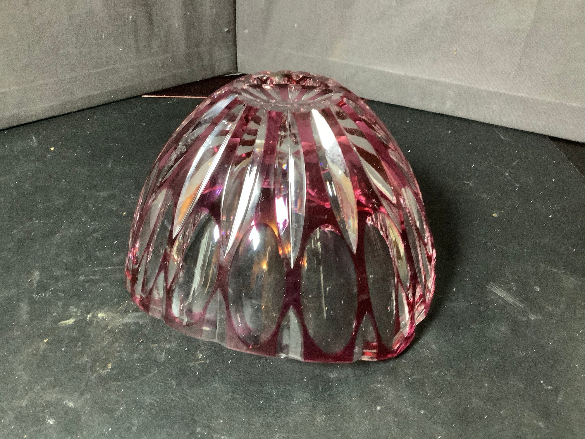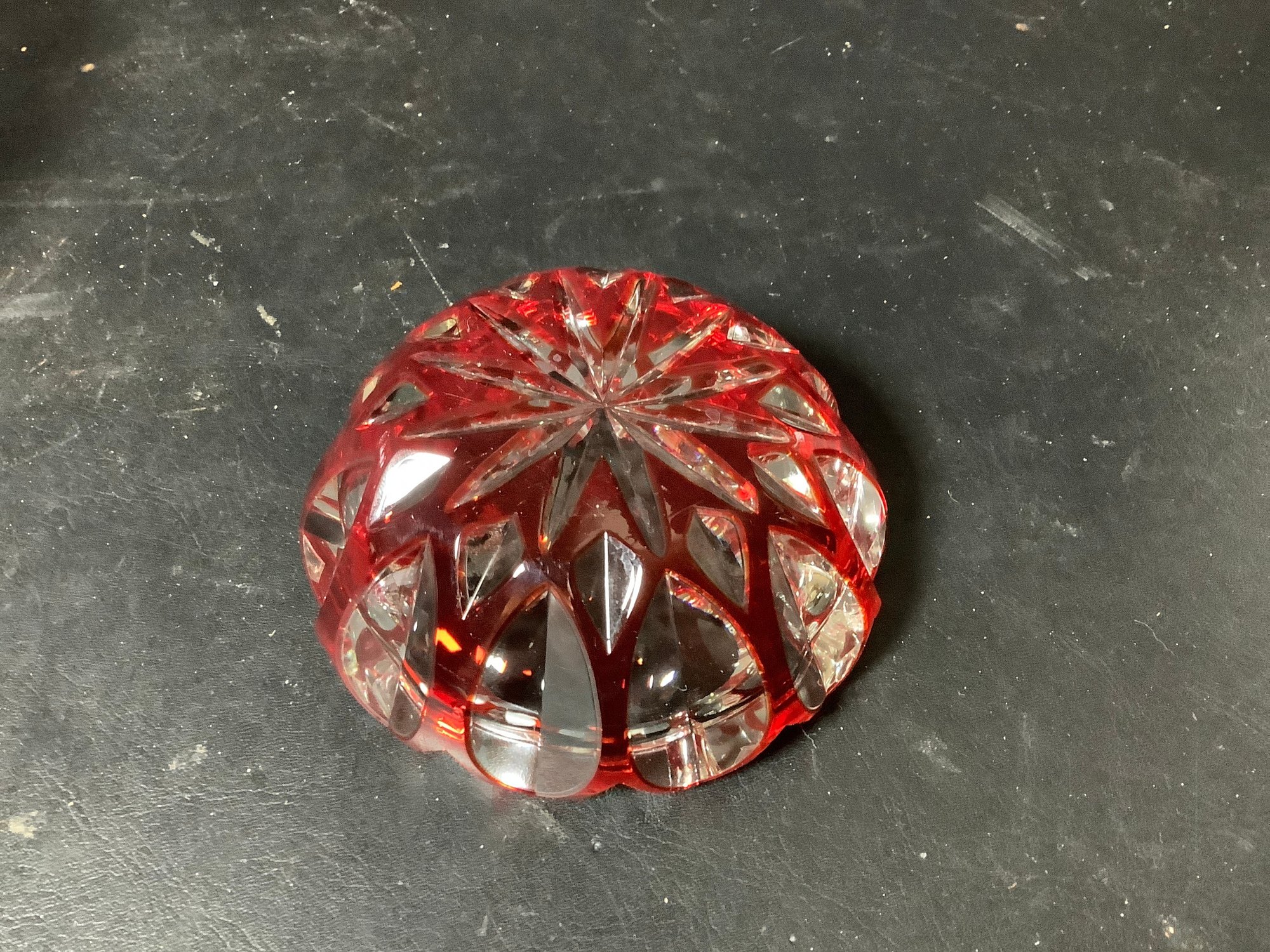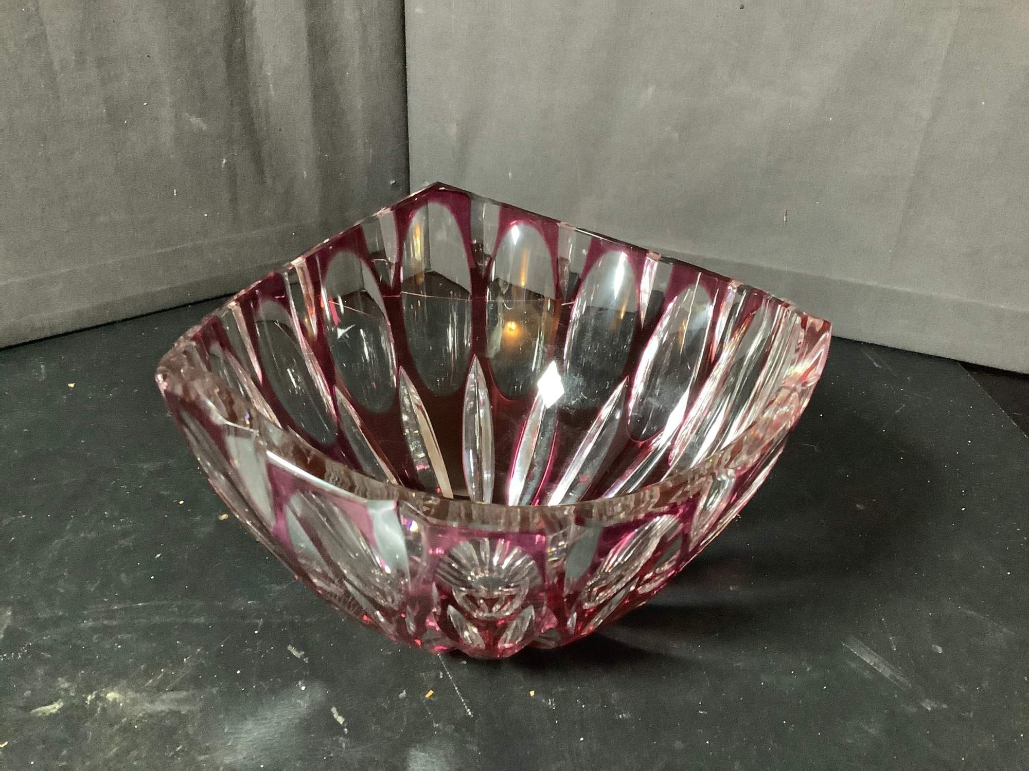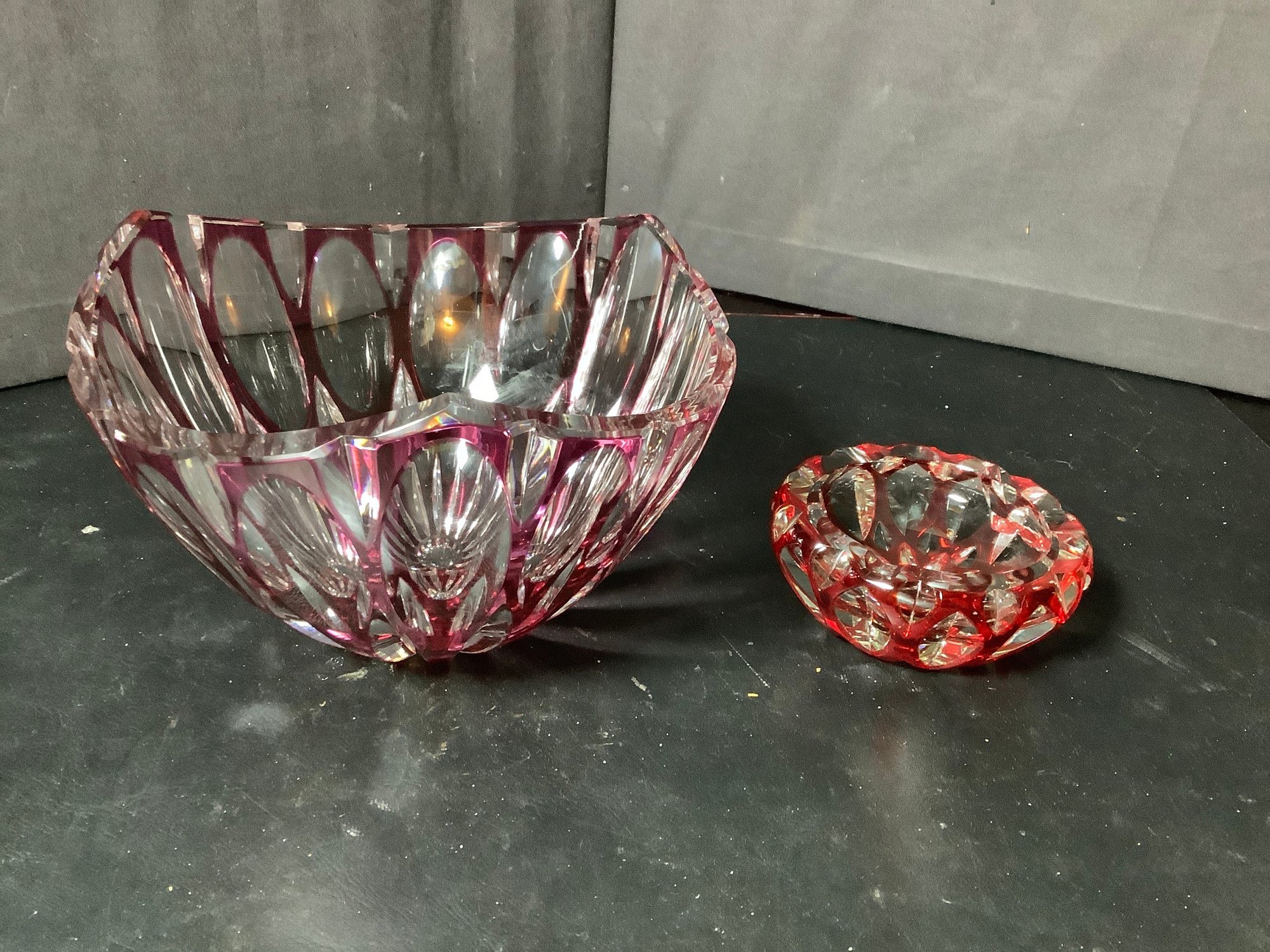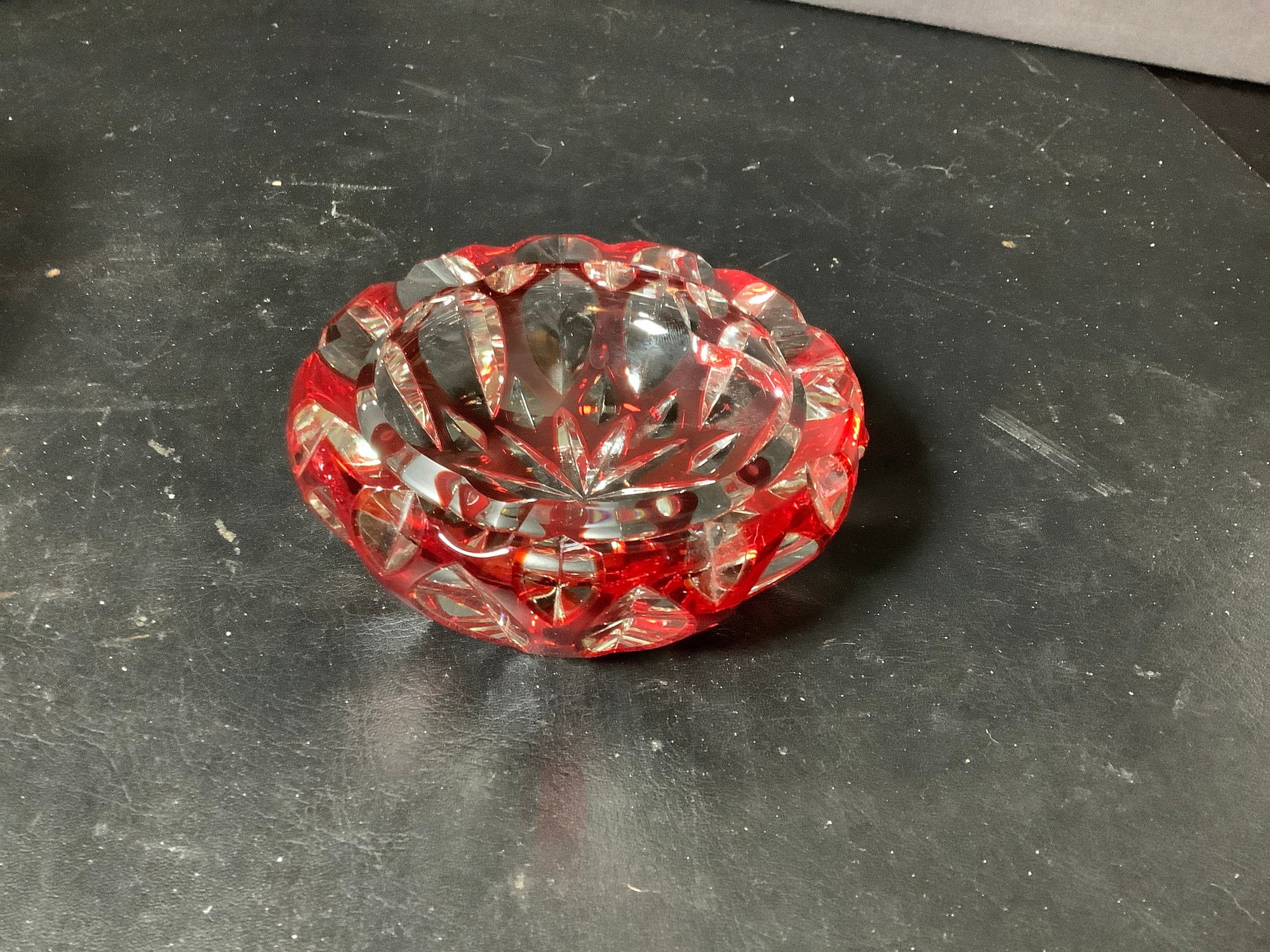 Red optic glass bowl and ash tray. Size of bowl 8-1/2” x 8-1/2” x 5” tall and ash tray 4-1/2” x 4-1/2” x 1-3/4” tall. Photos are part of the description. Preowned. NO SHIPPING!!