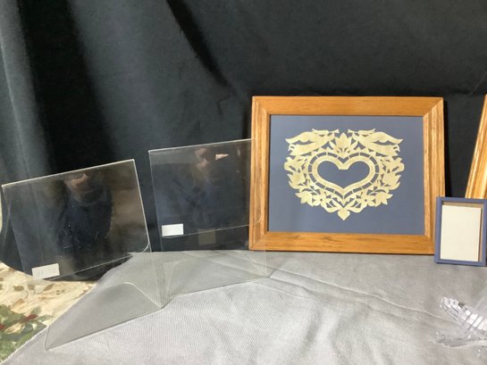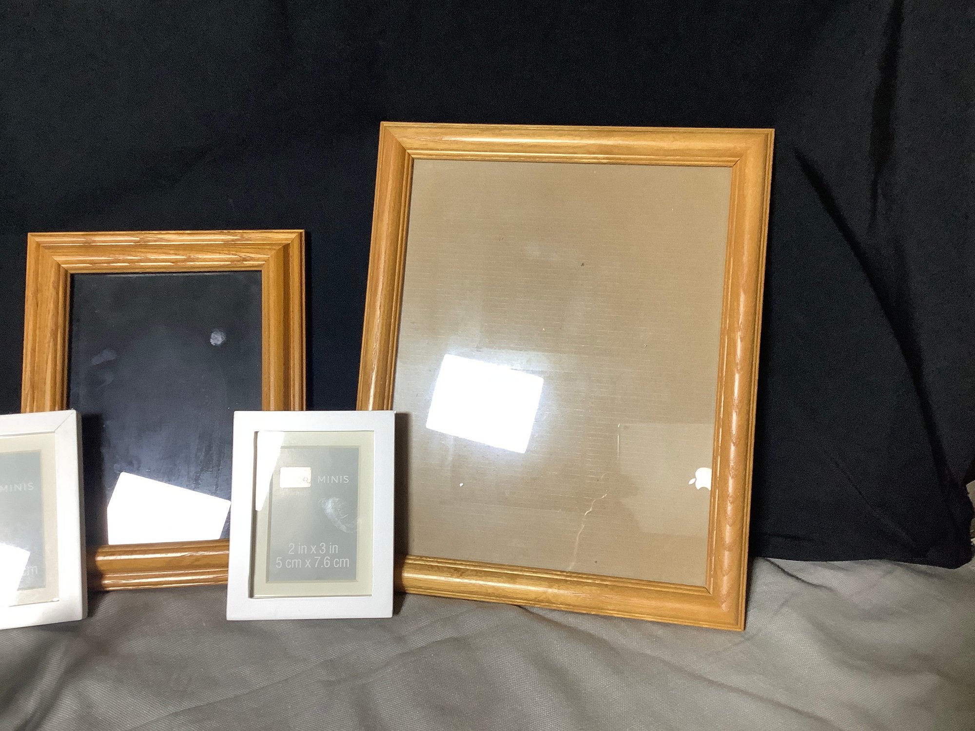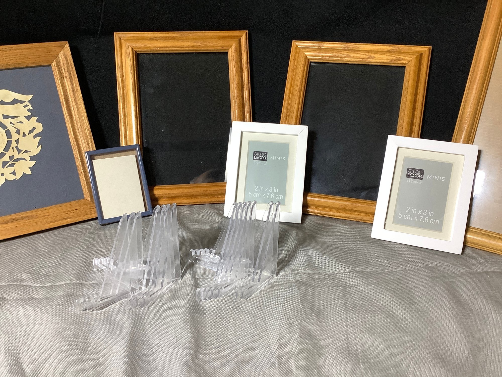 Group of picture frames largest is 10” x 10”. Small plastic stands 2-1/2” wide x 3-1/4” tall. Photos are part of the description. Preowned. NO SHIPPING!