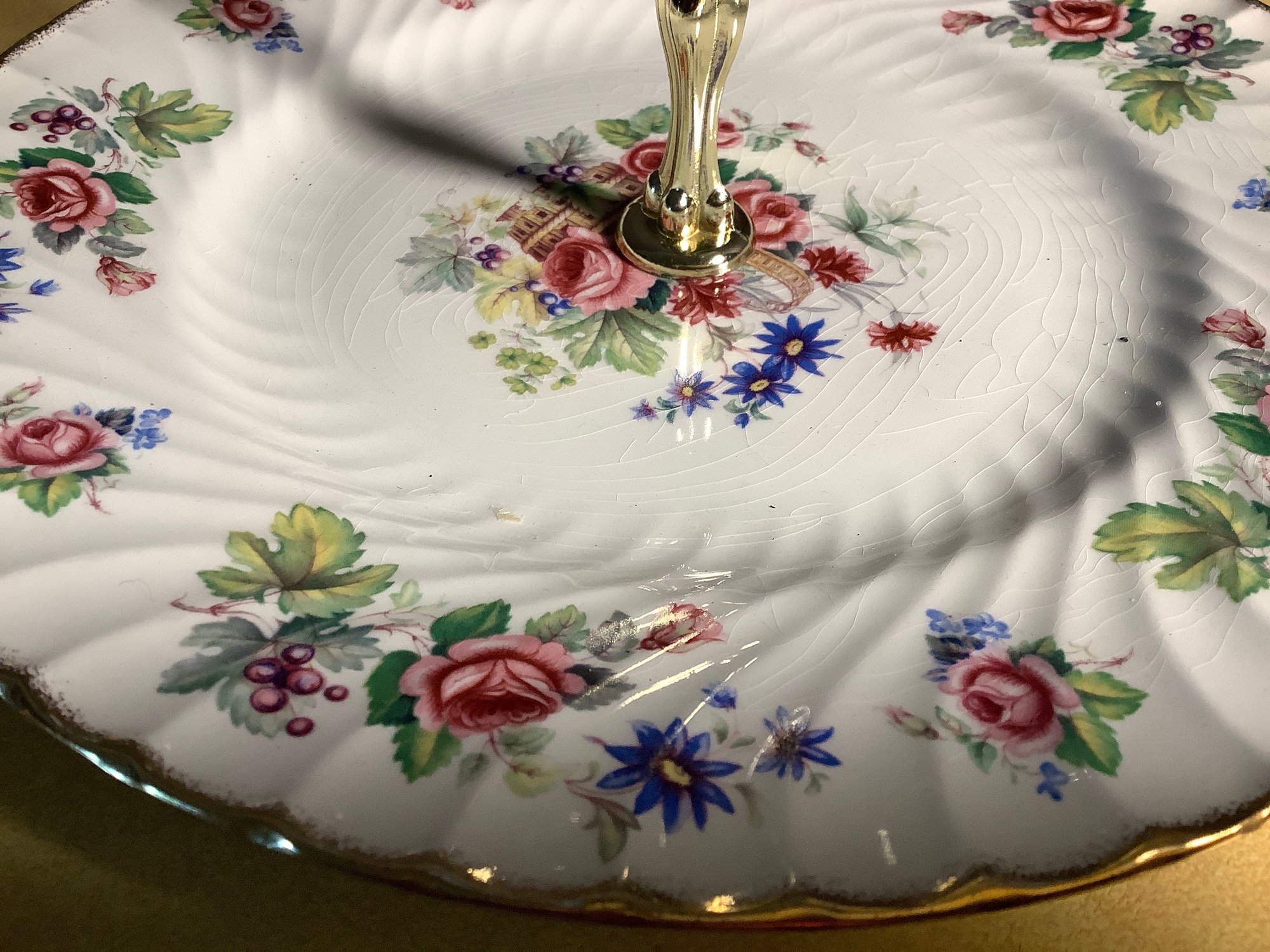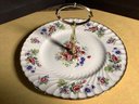 The Dish is decorated in houses of pink roses, asters and berries. It has a gold border and measures 10” across.