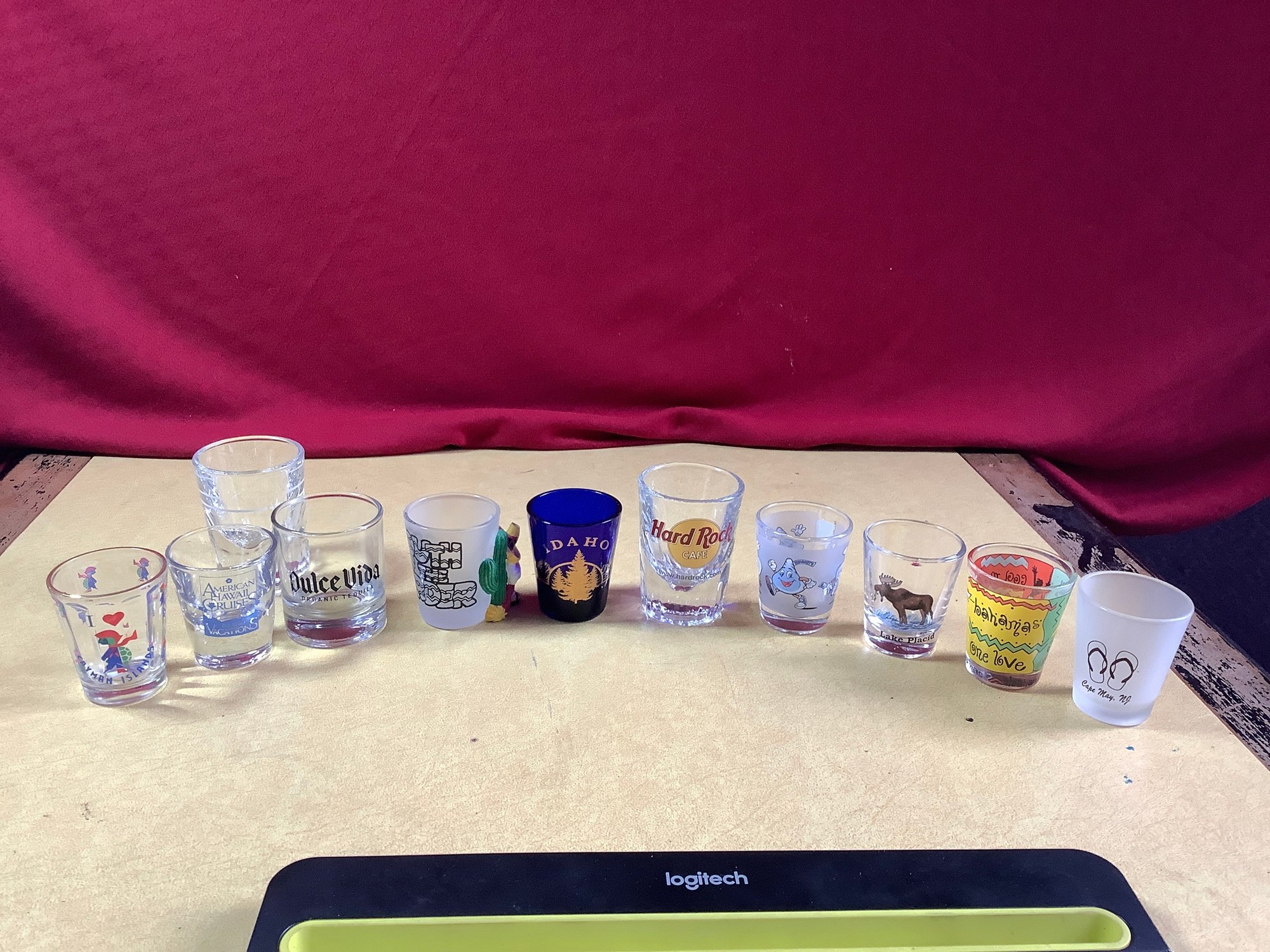 10 piece shot glass collection. Includes South of the Border, Hard Rock Cafe, Idaho, Hershey’s, Cape May and more. Photos are part of the description. NO SHIPPING.