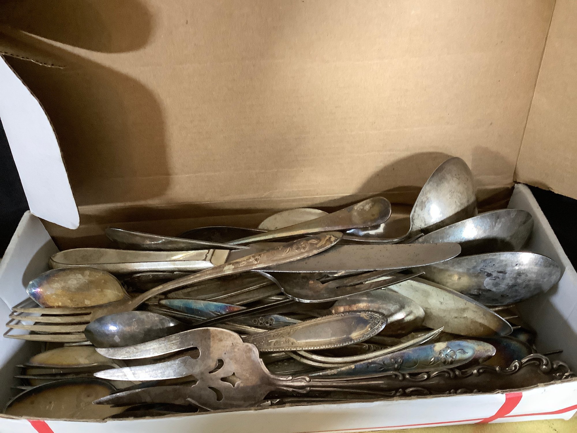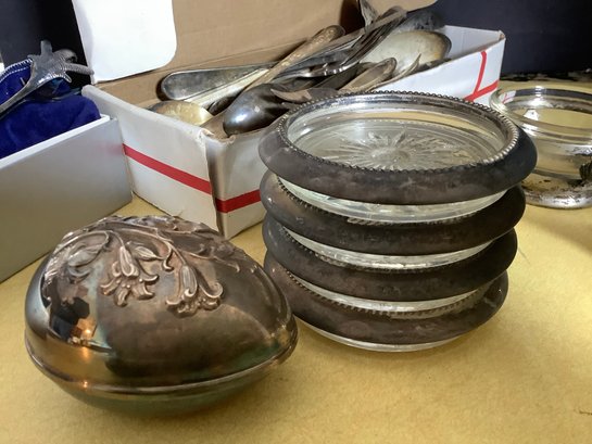Box full of silver plate serving utensils,