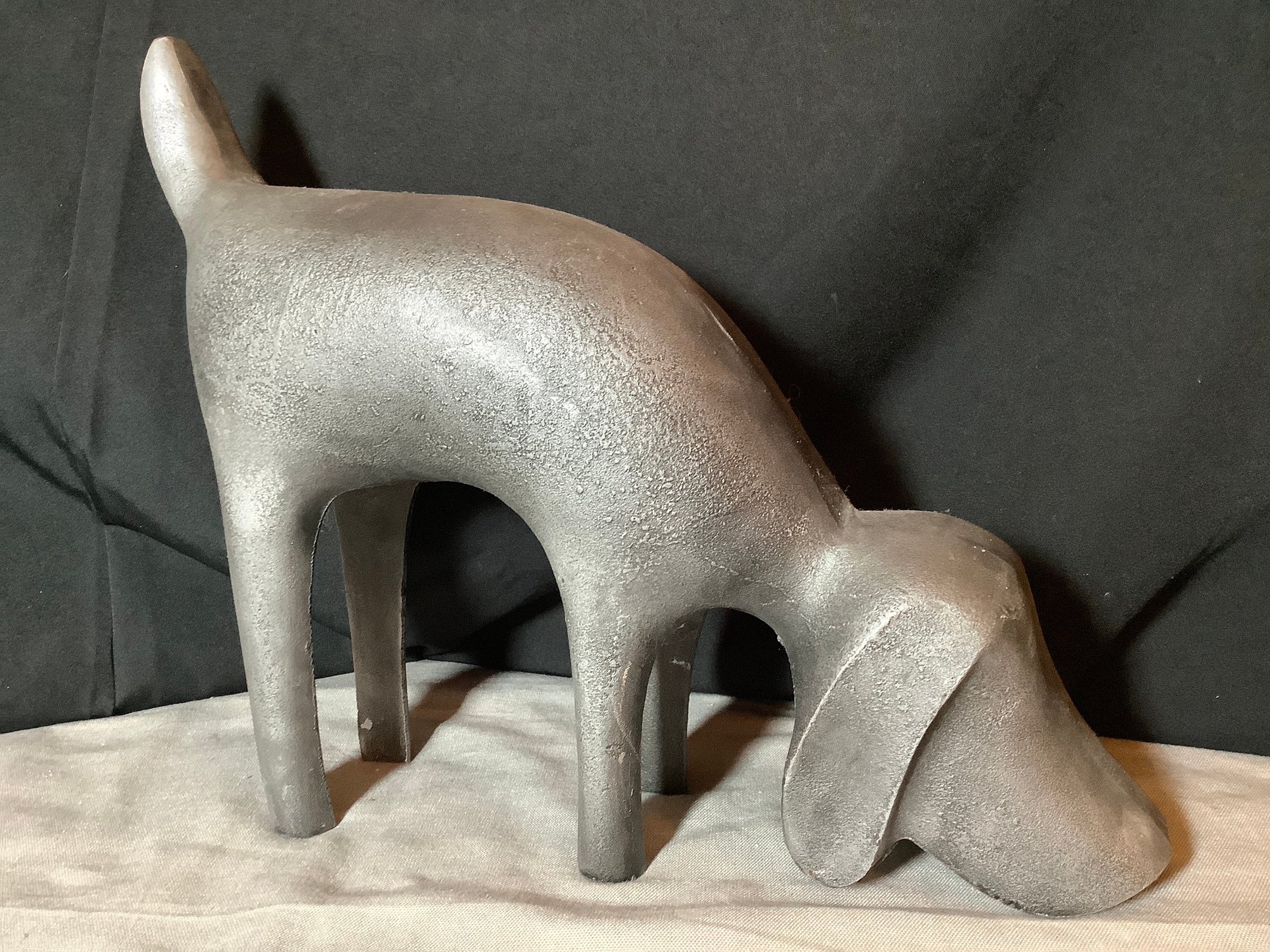 This is a metal figurine or statue of a sniffing dog.