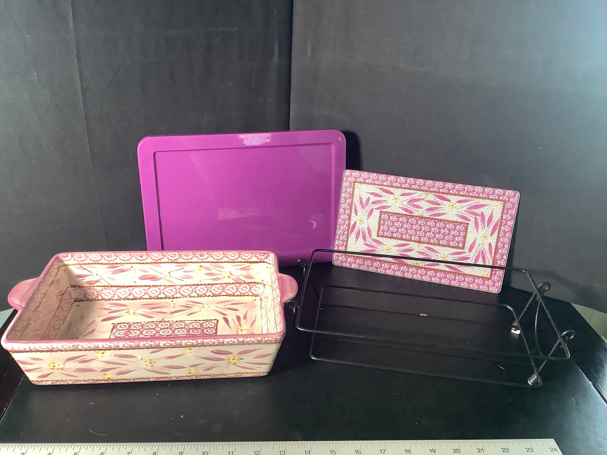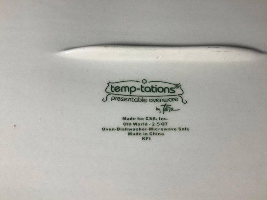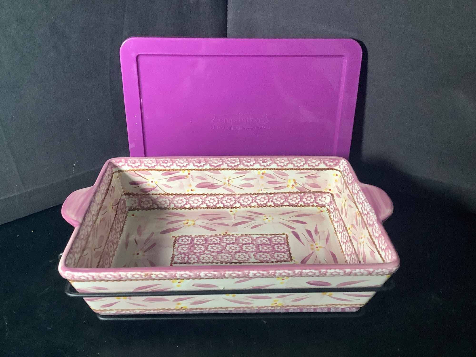 Temp-tations Lilac Old World Baking dish. Comes with wire rack, plastic cover and glass trivet.Size 2.5 quarts, approximately 11-1/2” x 7-1/2” x 3” tall. Preowned, but looks like it was never used . Photos are part of the description. NO SHIPPING!!!