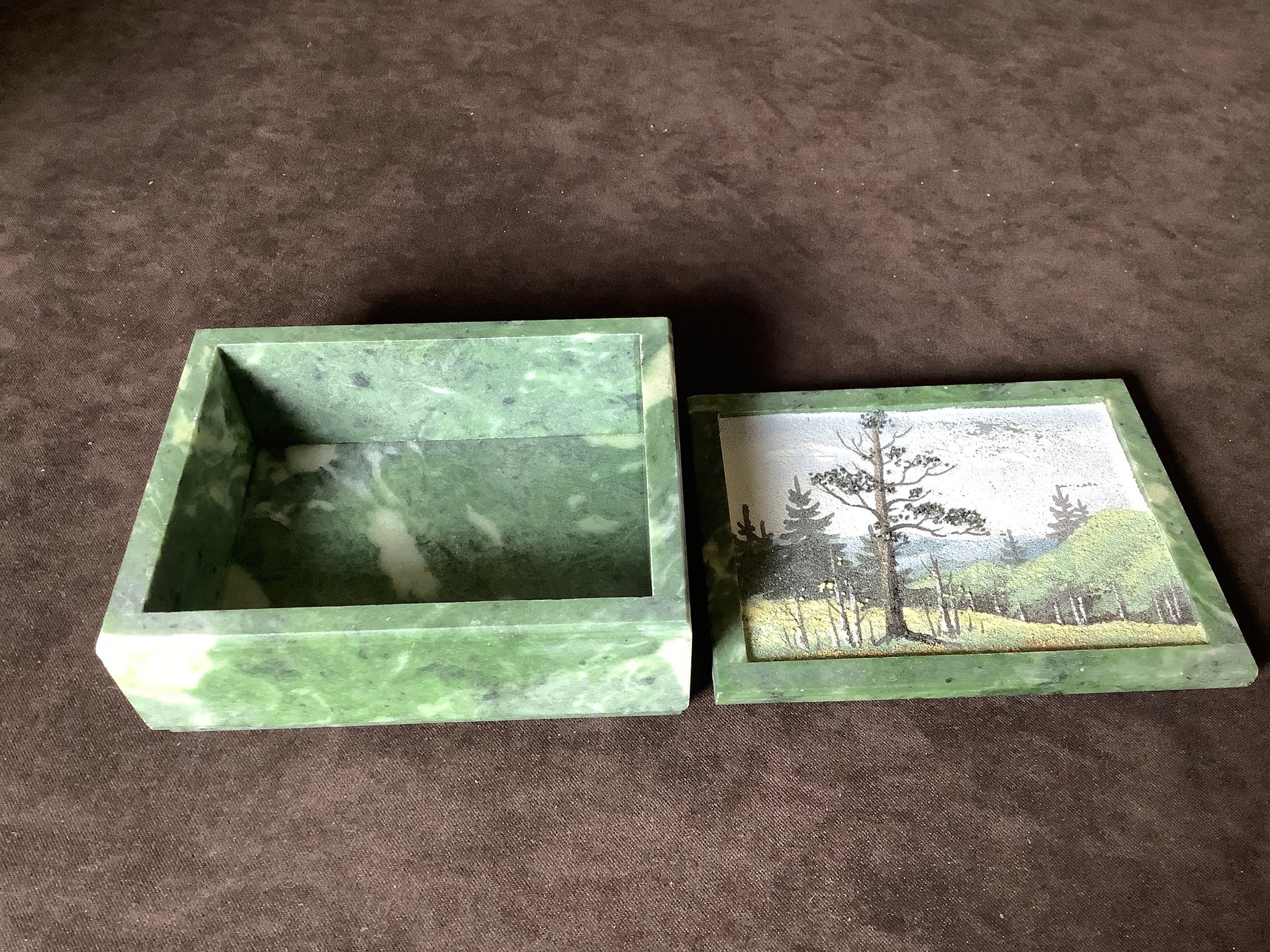 2.) The Lid of this green (possibly alabaster) trinket box is all hand painted. It is simply beautiful! It depicts a view from a mountain top with detailed hand painted trees.