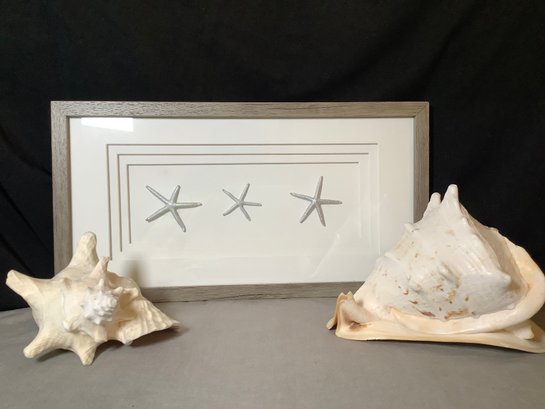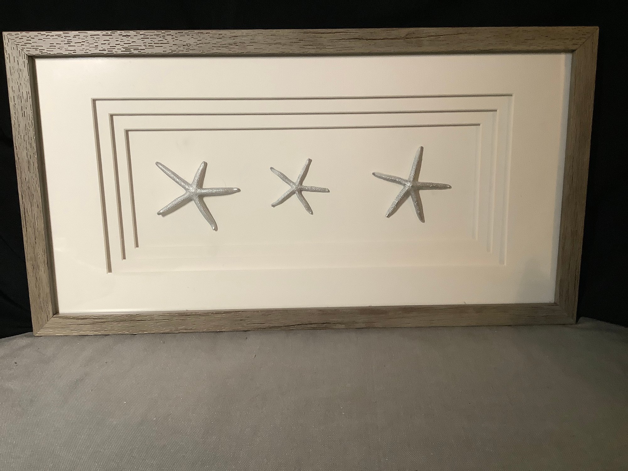 A tripple matted group of 3 star fish in a framed setting. (Not real)